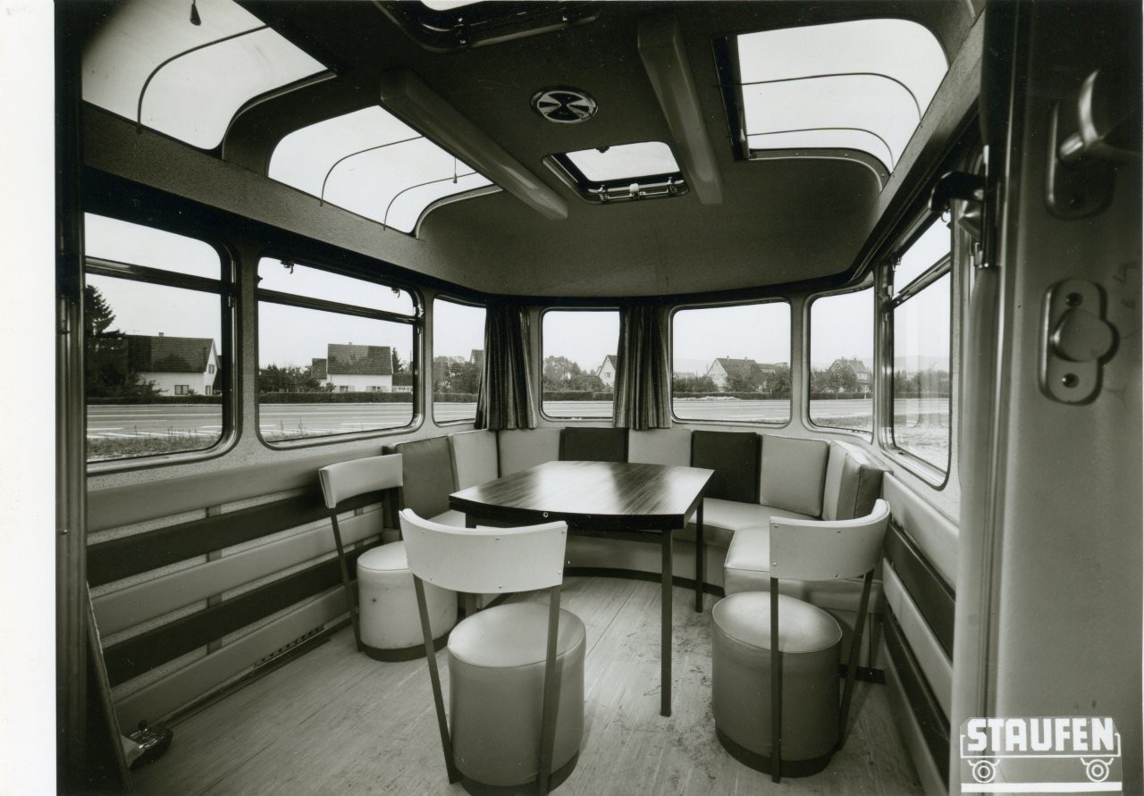 „Das ist ein Sattelzug, sprich ein LKW von Mercedes-Benz. Und von der Firma Staufen Fahrzeugwerke, einer schwäbischen Firma, wurde ein Auflieger gebaut, mit viel Glas, viel Aluminium und auch in Holzbauweise. Es wurde quasi ein riesengroßes Büro geschaffen, mit einer kleinen Küche und für die damalige Zeit modernen Kommunikationsmitteln. Da waren Telefone drin und da war sogar eine Soundanlage eingebaut.“