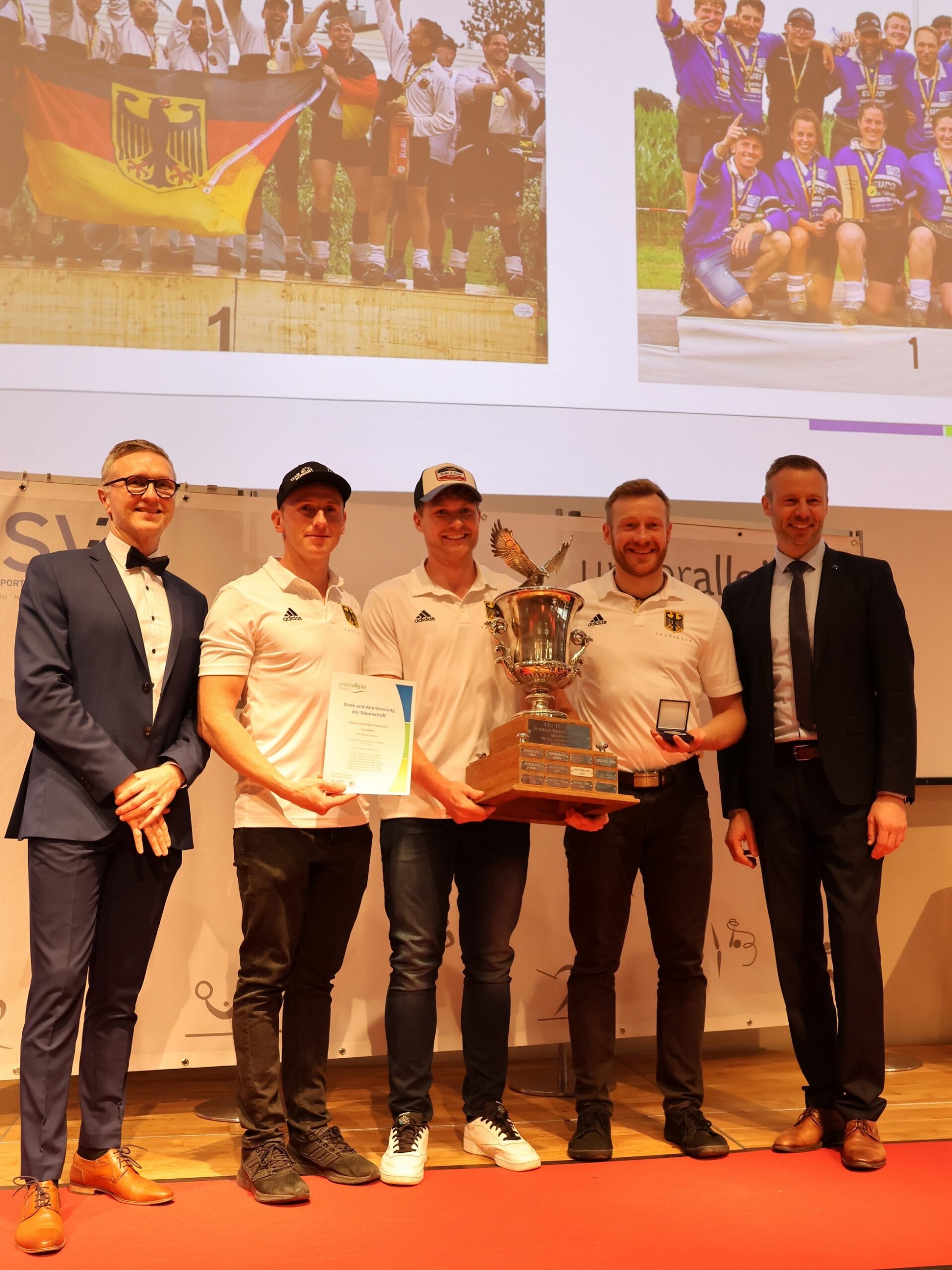 Eder würdigte die Geehrten als „Repräsentanten des Sports im Unterallgäu“ und betonte deren Durchhaltevermögen, auch nach Verletzungen oder Niederlagen. Für Benjamin Adelwarth ist Sport weit mehr als Wettbewerb: „Er bedeutet auch Heimat, Geborgenheit und Emotionen.“ Dass diese Emotionen bei der Ehrung spürbar waren, zeigte sich spätestens, als der Tauziehclub Allgäu Power Zell mit jubelnd erhobenem Weltmeisterpokal die Bühne betrat.