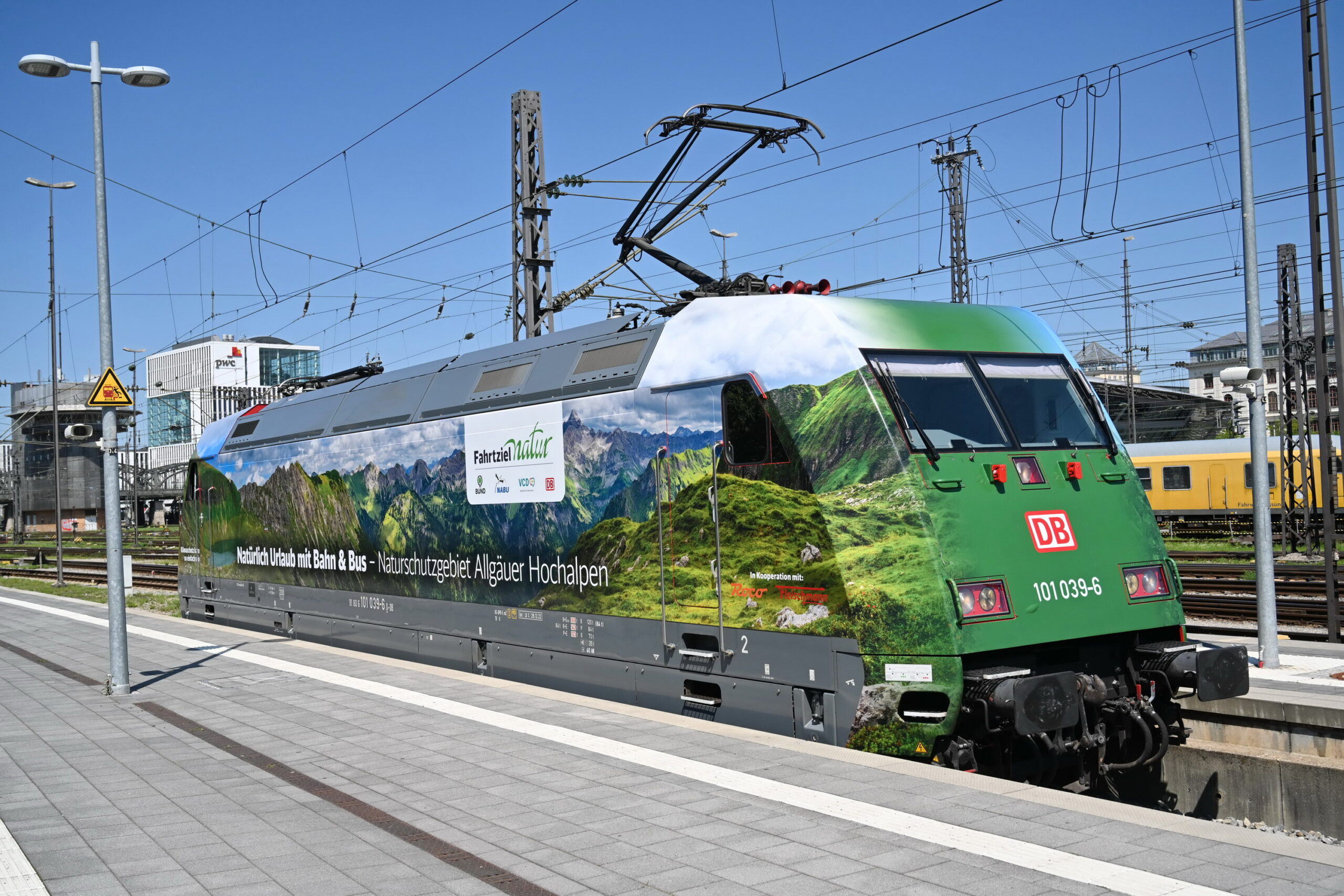 Das Naturschutzgebiet Allgäuer Hochalpen ist bekannt für seine Schönheit, Vielfalt und Eigenart. Jetzt hat das gern gebuchte Urlaubsziel, das an die Gemeinden Bad Hindelang und Oberstdorf sowie die Stadt Sonthofen angrenzt, einen neuen Botschafter: Eine besonders auffällig gestaltete Fernverkehrslok rollt künftig klimafreundlich Richtung Ferienparadies oder begegnet Bahnreisenden bei Fahrten von Intercity-1- oder Eurocity-Zügen. Die Lok der Baureihe 101 trägt auf einer Seite das auffällige und optisch anspruchsvolle Motiv mit dem Slogan „Natürlich Urlaub mit Bahn & Bus – Naturschutzgebiet Allgäuer Hochalpen“. Nur nach Oberstdorf selbst, und damit in die Hochalpen, kann sie nicht fahren – die Strecke ab Kempten ist bislang nicht elektrifiziert.