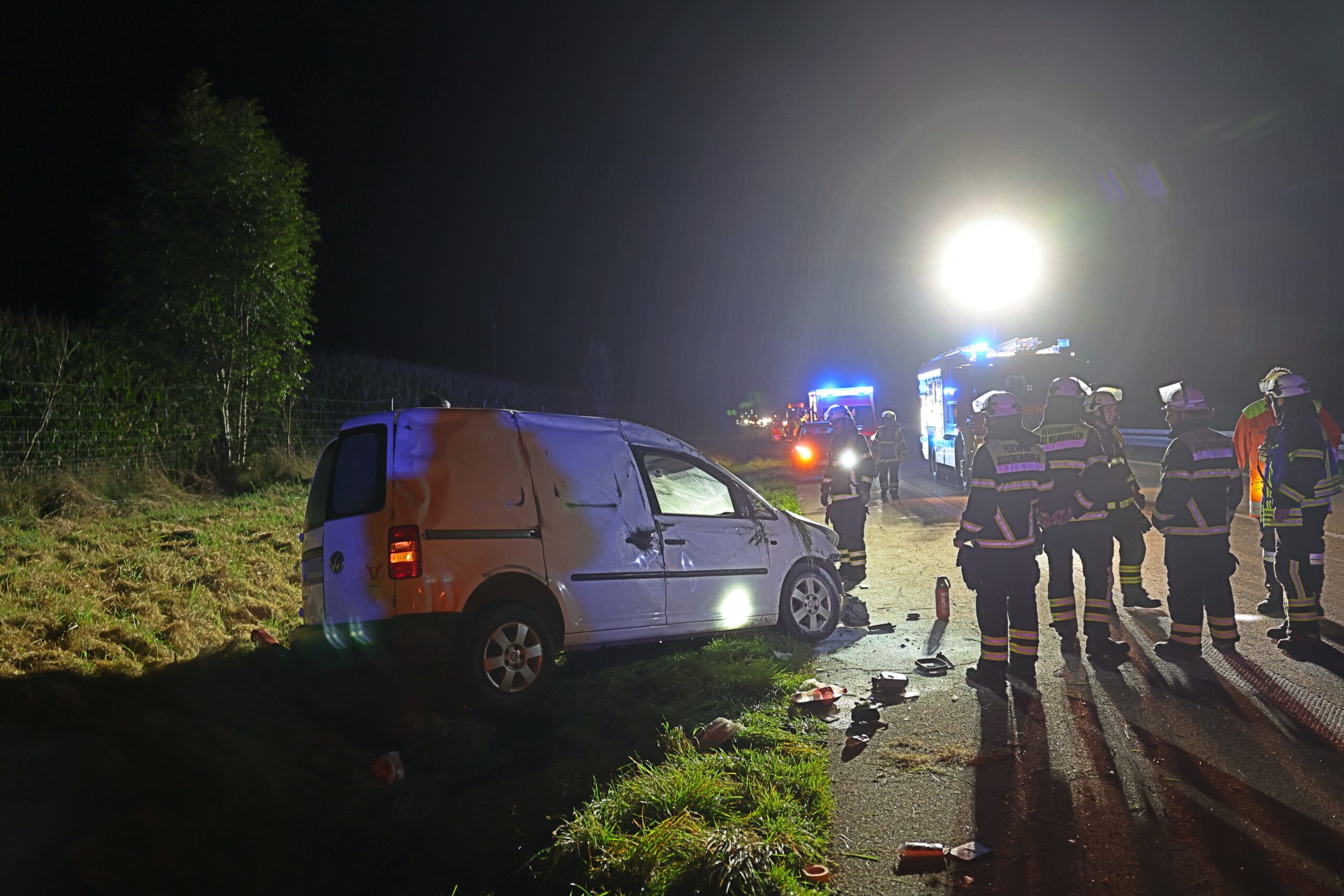 Auch ein im Fahrzeug befindlicher Hund erlitt Verletzungen und wurde in eine Tierarztpraxis gebracht. Die Feuerwehr Memmingen sicherte die Unfallstelle ab, da die Fahrbahn stark verschmutzt war und das Unfallfahrzeug geborgen werden musste. Für die Dauer von etwa einer Stunde blieb die Fahrtrichtung Lindau gesperrt. Der Sachschaden beläuft sich auf rund 16.000 Euro. Gegen den Unfallfahrer wurde ein Strafverfahren wegen gefährlichen Eingriffs in den Straßenverkehr eingeleitet.