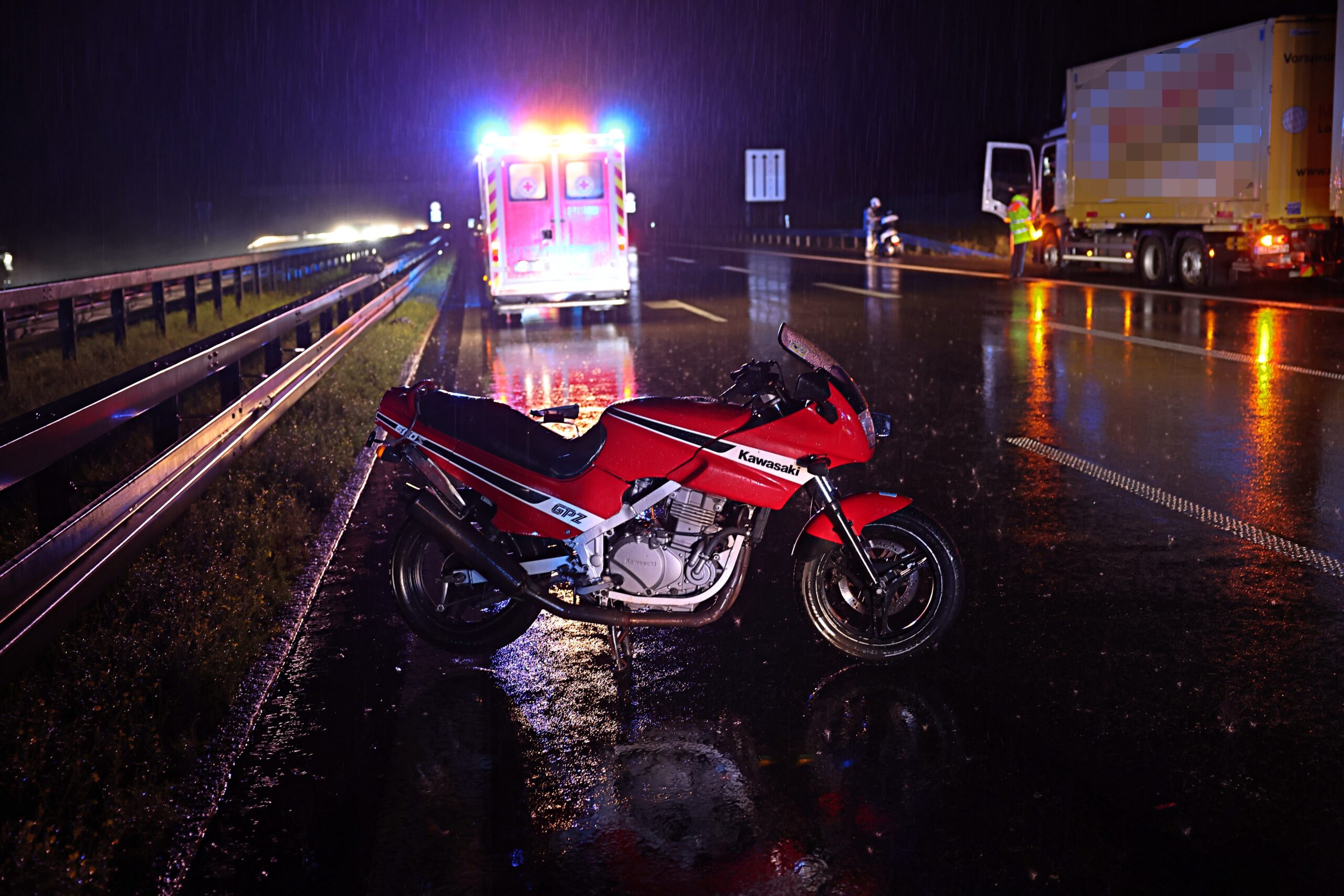 Zum Unfallzeitpunkt herrschte starker Regen, der die Sicht stark einschränkte. Durch die Kollision stürzte der Motorradfahrer und rutschte über die Fahrbahn, bis er im Grünstreifen an der Mittelschutzplanke zum Liegen kam. Das Motorrad blieb auf dem linken Fahrstreifen liegen.