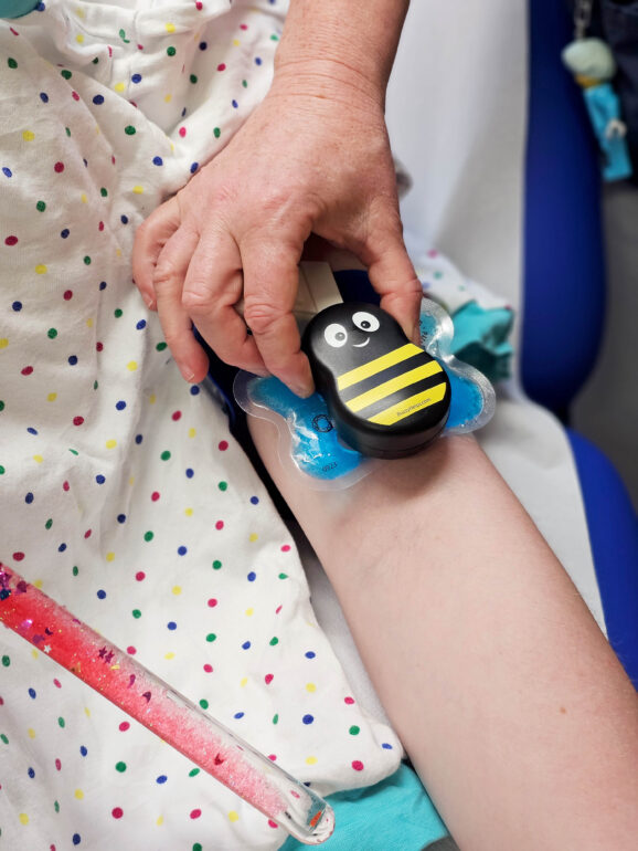 Eine wichtige Rolle spielt dabei die „Buzzy Bee“, eine kleine vibrierende Plastik-Biene mit austauschbaren Eisflügeln. Sie wird vor Blutentnahmen oder Infusionen auf die Einstichstelle gelegt, kühlt und vibriert gleichzeitig. „Dadurch kann das Gehirn den Schmerzreiz nicht mehr eindeutig verarbeiten – das Empfinden wird reduziert“, erklärt Pflegedienstleiterin und „Pain Nurse“ Michaela Nürnberger.