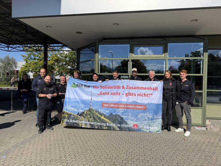 Die Ankündigung des Bosch-Konzerns, deutschlandweit 13.000 Stellen abzubauen, sorgt für wachsende Unsicherheit an den bayerischen Standorten. Besonders betroffen ist der Standort Immenstadt, wo von insgesamt 4.200 Arbeitsplätzen 650 wegfallen sollen. Am Nachmittag versammelten sich Beschäftigte des Standort Immenstadt am Werkstor. Auch Vor Ort Bayerns IG Metall-Bezirksleiter Horst Ott, sowie die 1. Bevollmächtigte des IG Metall Allgäu Jasmin Steinert.
