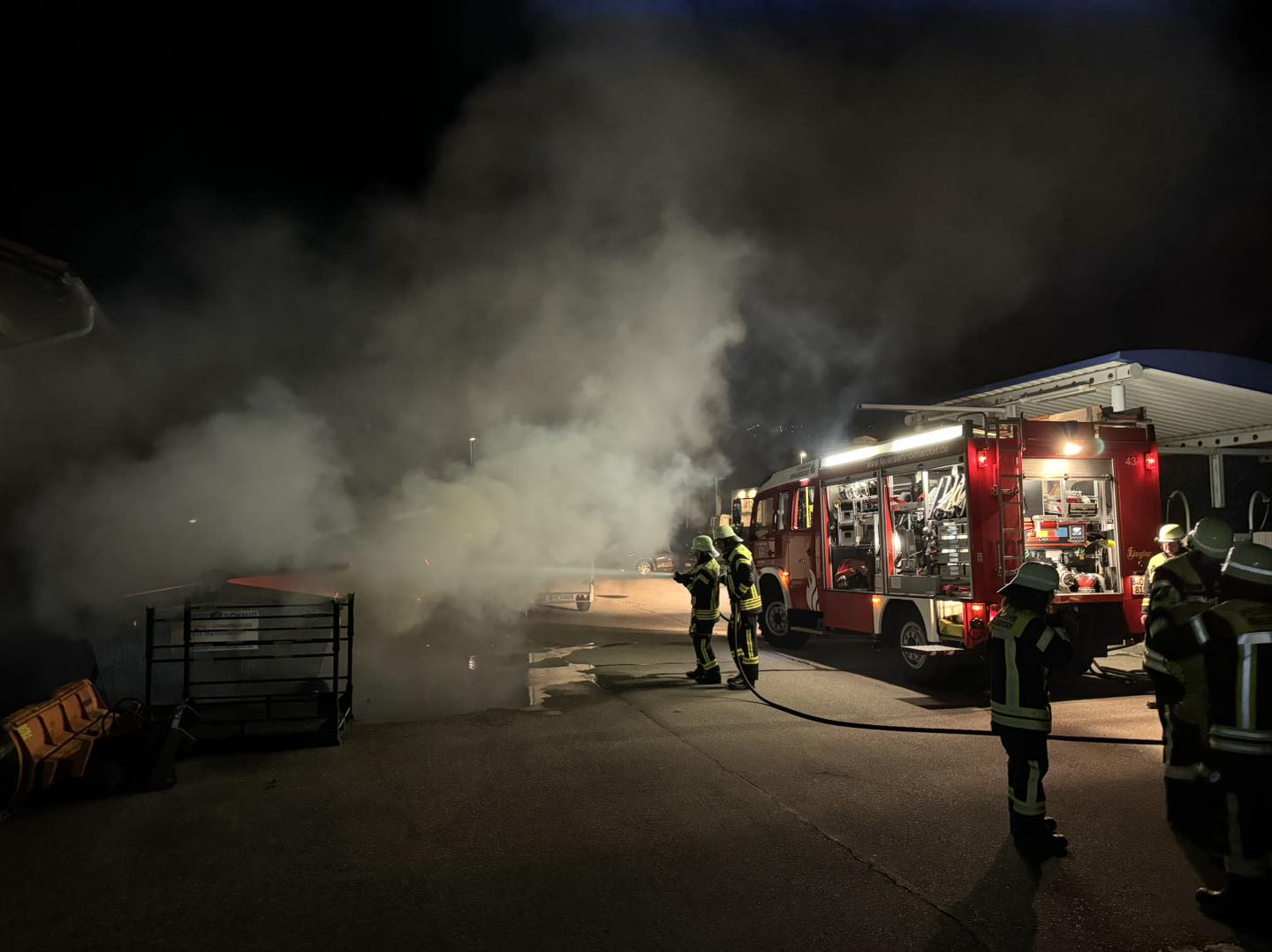 Gegen 21:40 Uhr schrecken die Bewohner von Bihlerdorf hoch. Die Sirene des Ortes ist lautstark zu hören. Die Feuerwehrleute aus Bihlerdorf machen sich auf den Weg zum Brandobjekt nahe einem Autohaus im Gewerbegebiet „Im Wasen“. Auch die Feuerwehrkräfte aus dem Hauptort Blaichach sind mitalarmiert worden und besteigen ihre Fahrzeuge, um sich auf den etwa ein- bis eineinhalb Kilometer weiten Weg in den Ortsteil zu machen. Aus dem Metallcontainer qualmt es. Als die Feuerwehrkräfte diesen öffnen, schlagen ihnen Flammen entgegen. Sofort werden mit Wasser die Löscharbeiten gestartet. Die Polizei nimmt Zeugenaussagen auf. Als AllgäuHIT nach 23 Uhr bei der in der Nacht für Pressenanfragen zuständige Einsatzzentrale in Kempten nachfragt, heißt es: Die Fahndungsmaßnahmen vor Ort laufen noch.