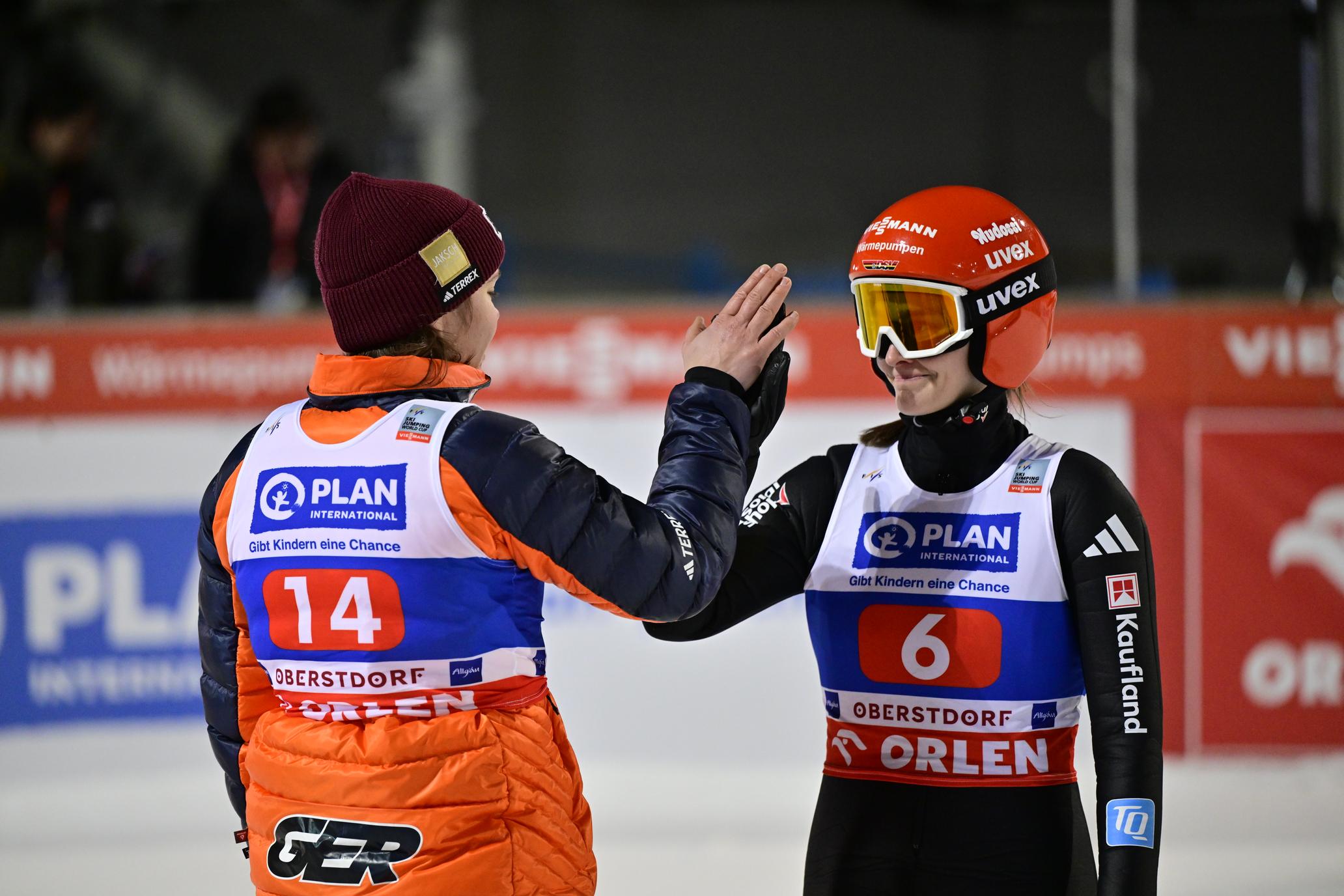 Freude beim deutschen Team darüber, dass Selina Freitag am Ende als Dritte auf dem Podium landete – bei der Gesamtwertung wurde sie sogar Zweite. Zurück zum Skisprung-Weltcup in Oberstdorf: Agnes Reisch wurde zweitbeste Deutsche auf Rang 9. Katharina Schmid wurde Elfte, Juliane Seyfarth komplettierte das deutsche Feld mit einem 16. Platz.