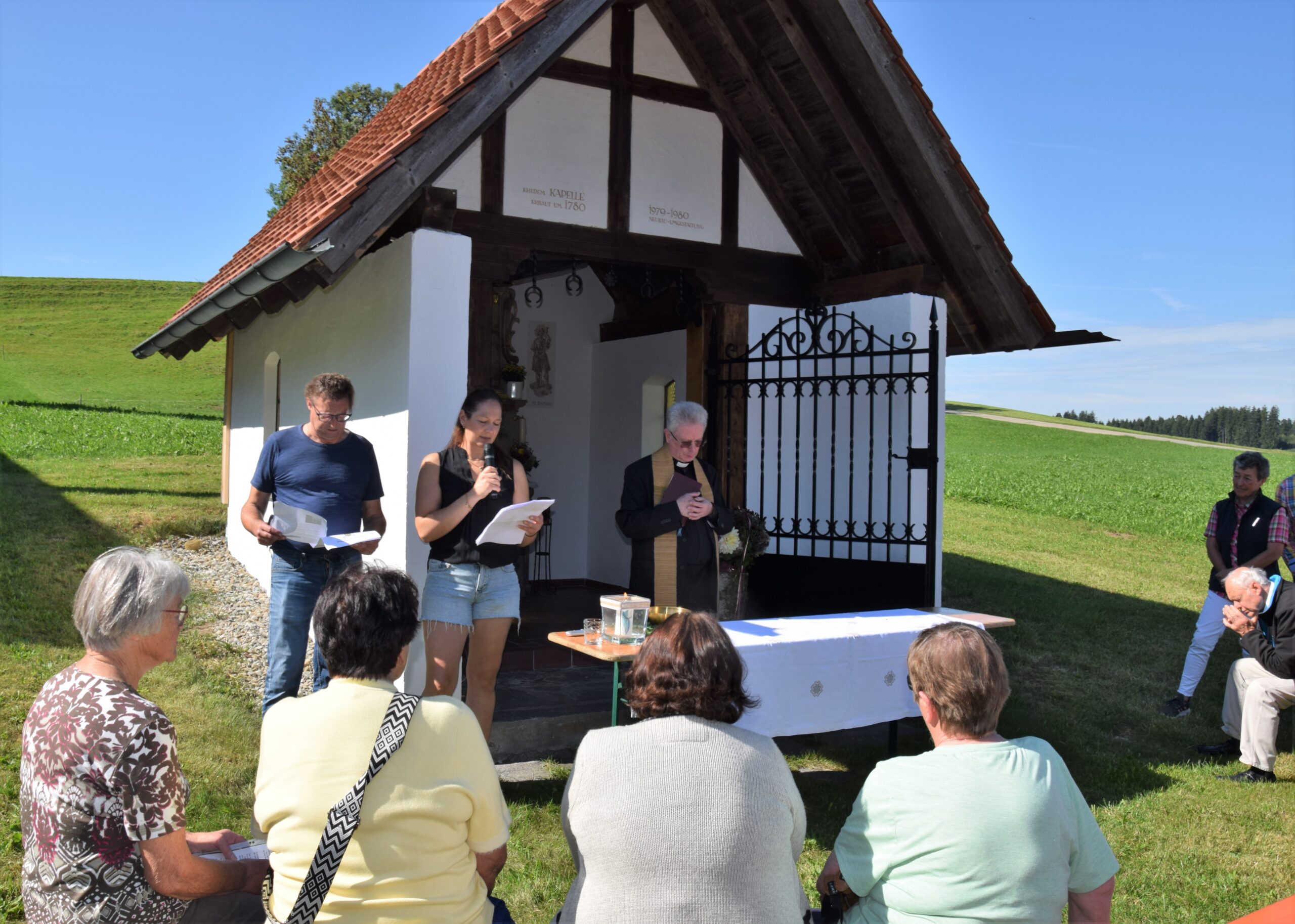 Die Glocke der kleinen Kapelle mit den Patronen St. Rochus und St. Sebastian läutet seit einiger Zeit wieder drei Mal täglich und erinnert die Gläubigen daran: „Vergesst den Herrgott nicht“. Zum Abschluss der Renovierungsarbeiten am Zwiebelturm und dem Gebäude des Kleinods durch die Bewohner des kleinen Weilers segnete am Sonntag Pfarrer Manfred Gromer die Kapelle und dankte den Erschaffern und freiwilligen Helfern für ihre Arbeit. „Das ist ein Zeichen, dass der Herr in Hettisried willkommen ist“, betonte der Geistliche.