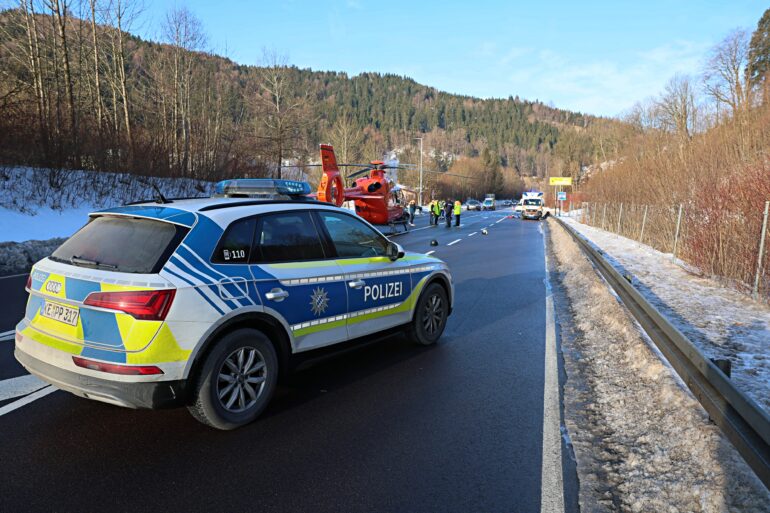 Am 17.01.2026 kurz nach 08:30 Uhr kam es auf der B12 bei Seltmans zu einem schweren Verkehrsunfall zwischen einem 41-jährigen Fahrradfahrer und einem 24-jährigen Pkw-Fahrer. Nach dem derzeitigen polizeilichen Ermittlungsstand befuhr der Fahrradfahrer zur Unfallzeit die Staatsstraße 2001 von Seltmans kommend und bog nach links auf die B12 in Richtung Isny ab. Hierbei übersah der 41-Jährige den von links kommenden Pkw des vorfahrtsberechtigten 24-Jährigen, wodurch es im Einmündungsbereich zur Kollision der Fahrzeuge kam. Der 41-Jährige verstarb trotz sofortiger Reanimationsmaßnahmen noch an der Unfallstelle. Im Rahmen der Unfallaufnahme konnte bei dem 24-jährigen Pkw-Fahrer Alkoholgeruch festgestellt werden. Ein durchgeführter Atemalkoholtest vor Ort ergab einen positiven Wert, weshalb im Anschluss eine Blutentnahme bei diesem durchgeführt wurde. Die beiden Pkw-Insassen erlitten durch den Unfall einen Schock und wurden durch ein Kriseninterventionsteam betreut. An beiden Fahrzeugen entstand ein Gesamtschaden in Höhe von circa 20.000 Euro, der Pkw wurde abgeschleppt. Die B12 war für die Unfallaufnahme im Bereich der Unfallstelle für circa vier Stunden vollständig gesperrt. An der Unfallstelle waren neben zahlreichen Polizeikräften auch der Rettungsdienst, sowie ein Rettungshubschrauber im Einsatz. Zur Verkehrsregelung unterstützte die Autobahnmeisterei Sulzberg und Straßenmeisterei Kempten. Zur abschließenden Klärung der Unfallursache wurde ein Gutachter hinzugezogen. (VPI Kempten)