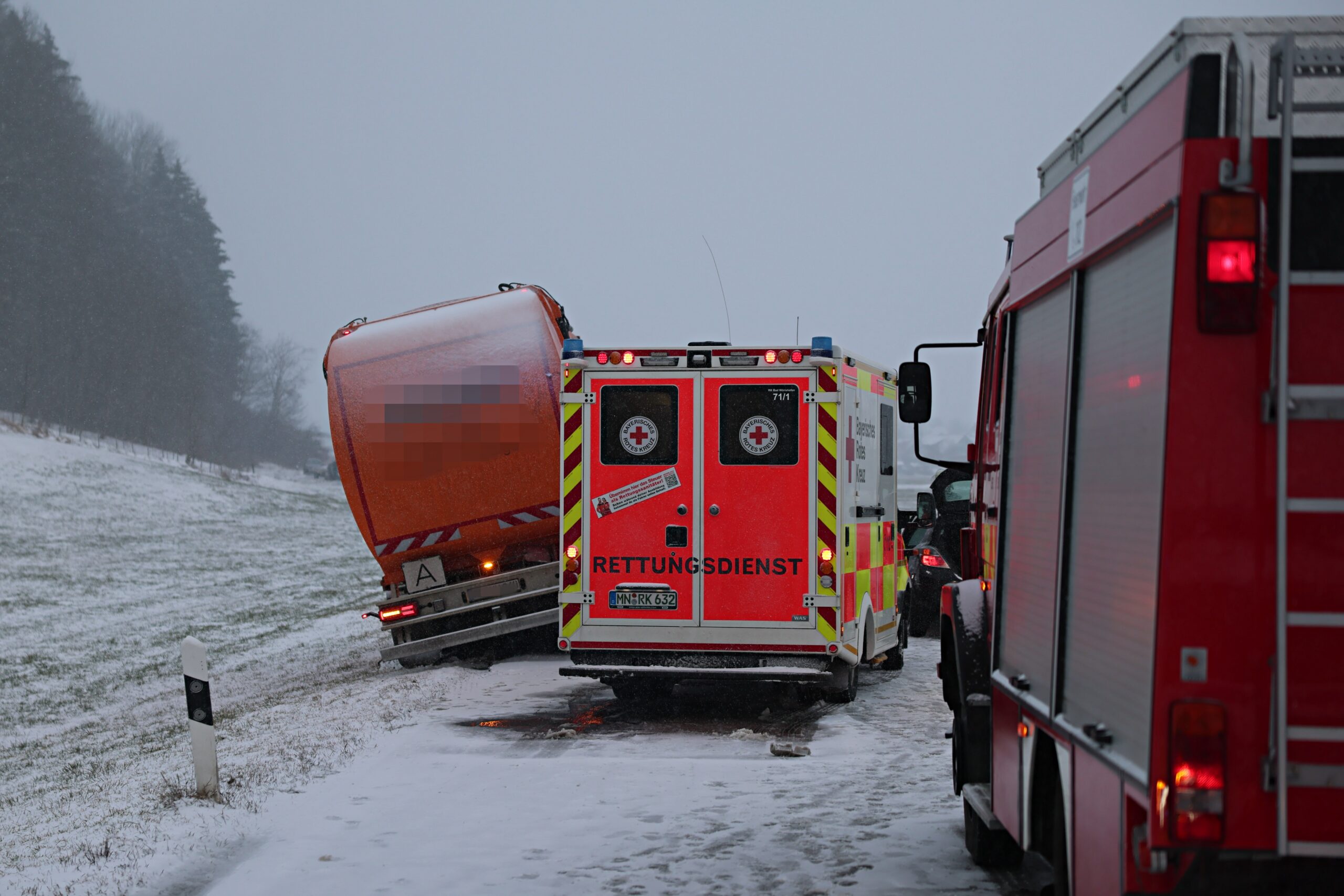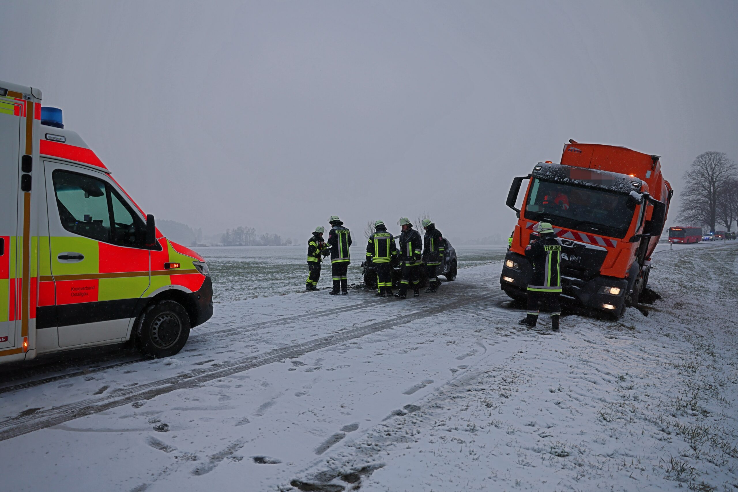Während der Bergungsarbeiten kam es zu einem weiteren Zwischenfall: Ein Müllentsorgungsfahrzeug, das an der Unfallstelle vorbeifahren wollte, geriet von der Straße ab und musste ebenfalls geborgen werden.