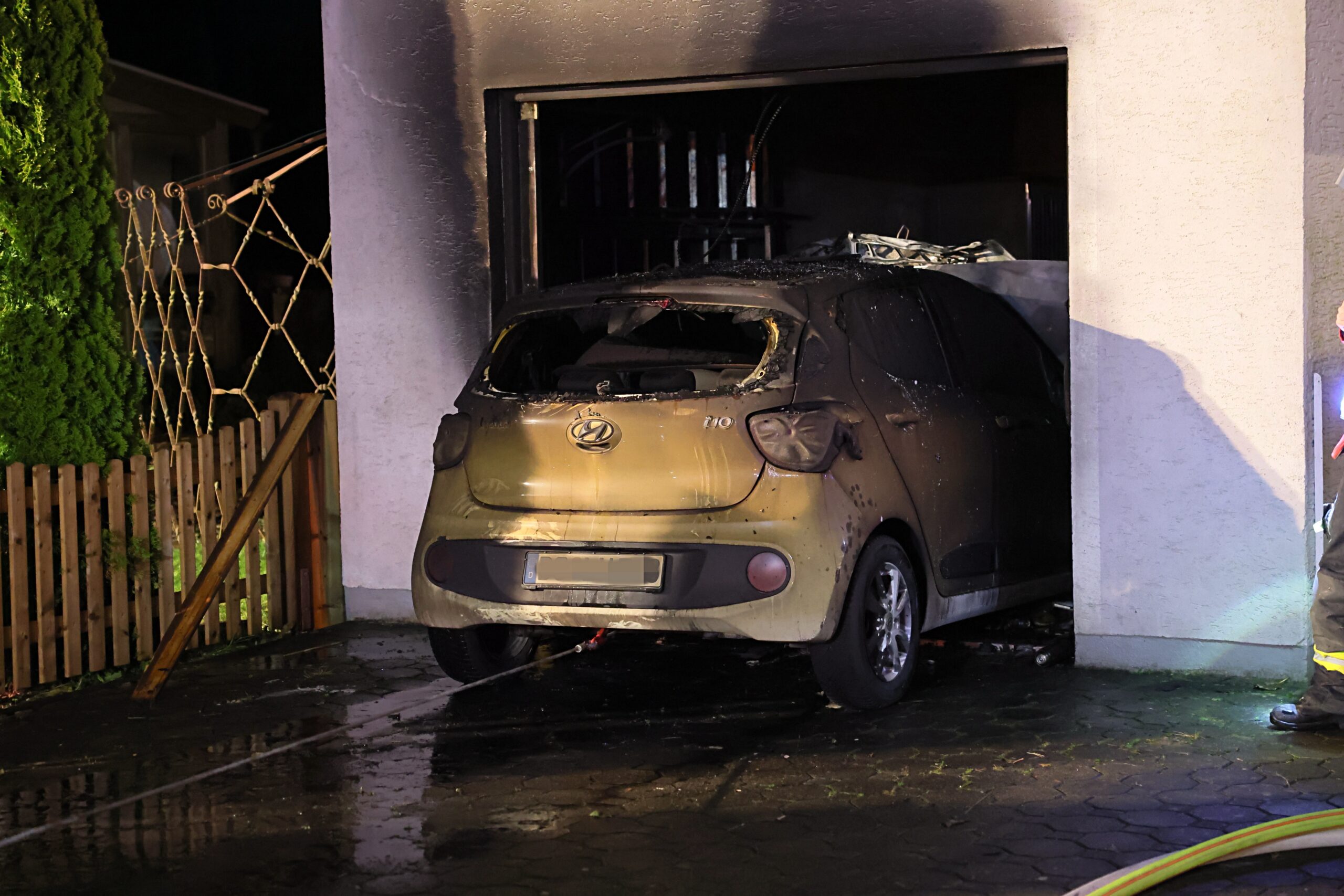 Nach dem Löschen der Glutnester zogen die Feuerwehrleute das Fahrzeug mithilfe eines Greifzugs aus der Garage, um weitere Gefahren auszuschließen. Der Dachboden sowie die Decke der Garage wurden anschließend sorgfältig mit einer Wärmebildkamera auf versteckte Glutnester untersucht.