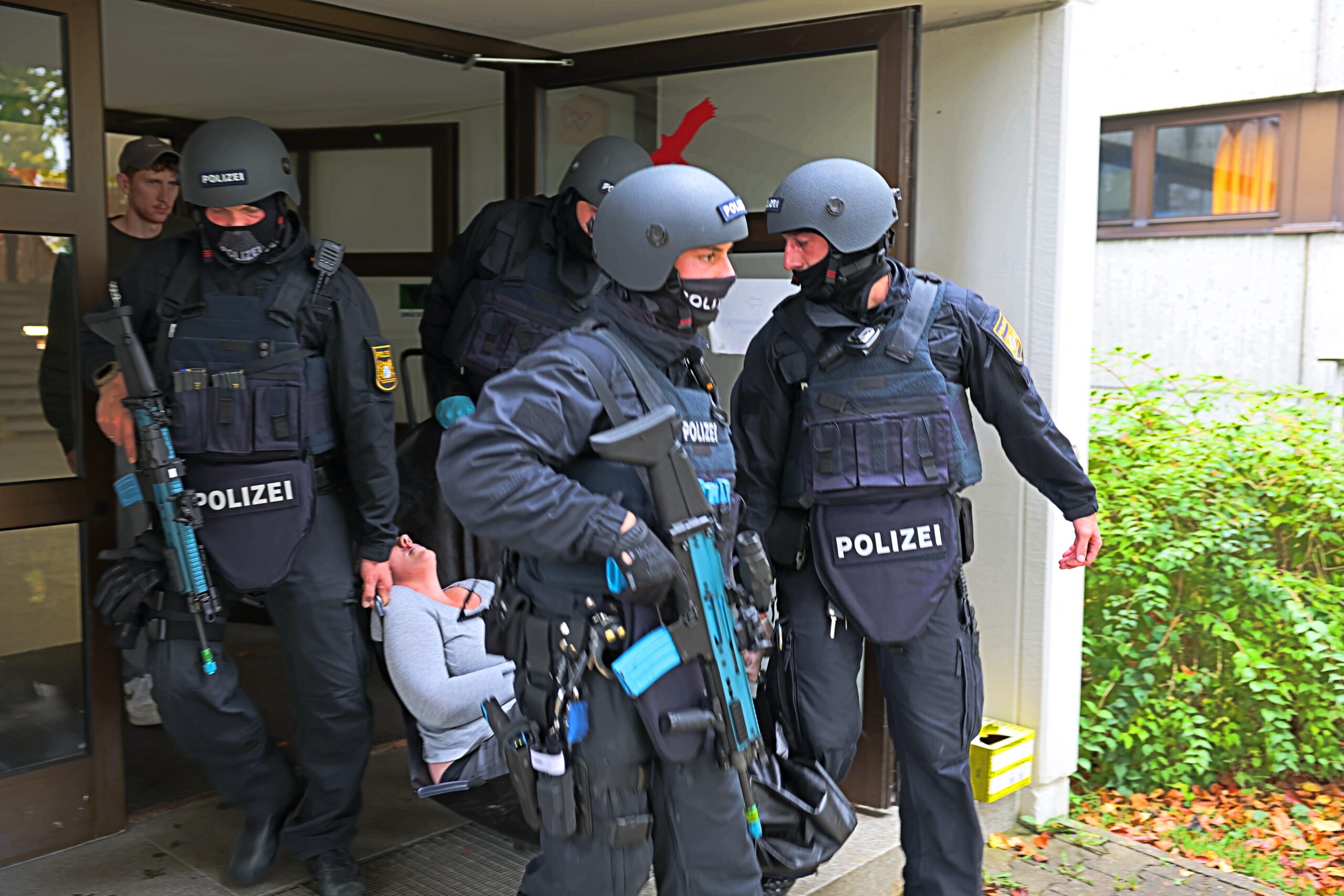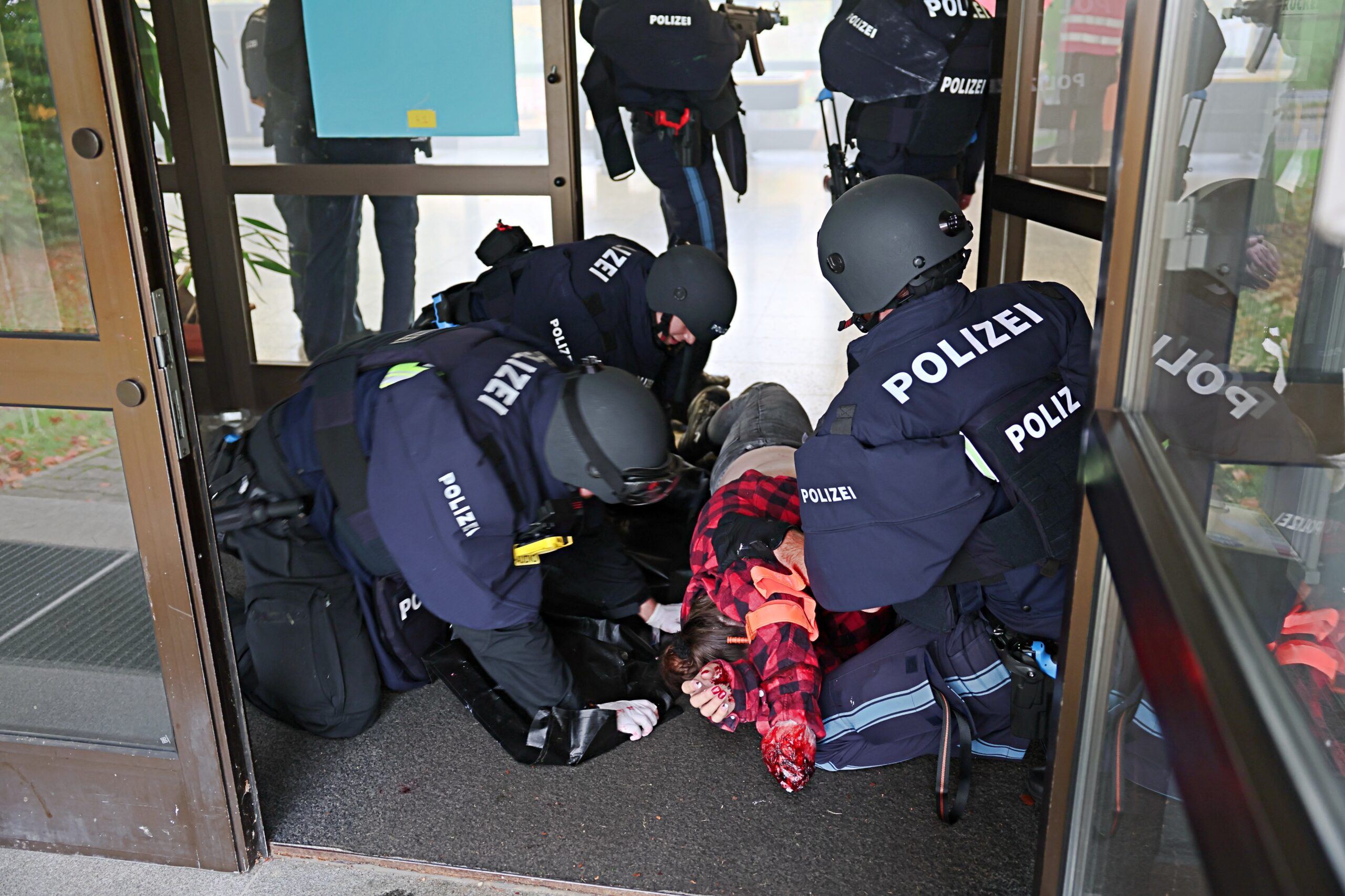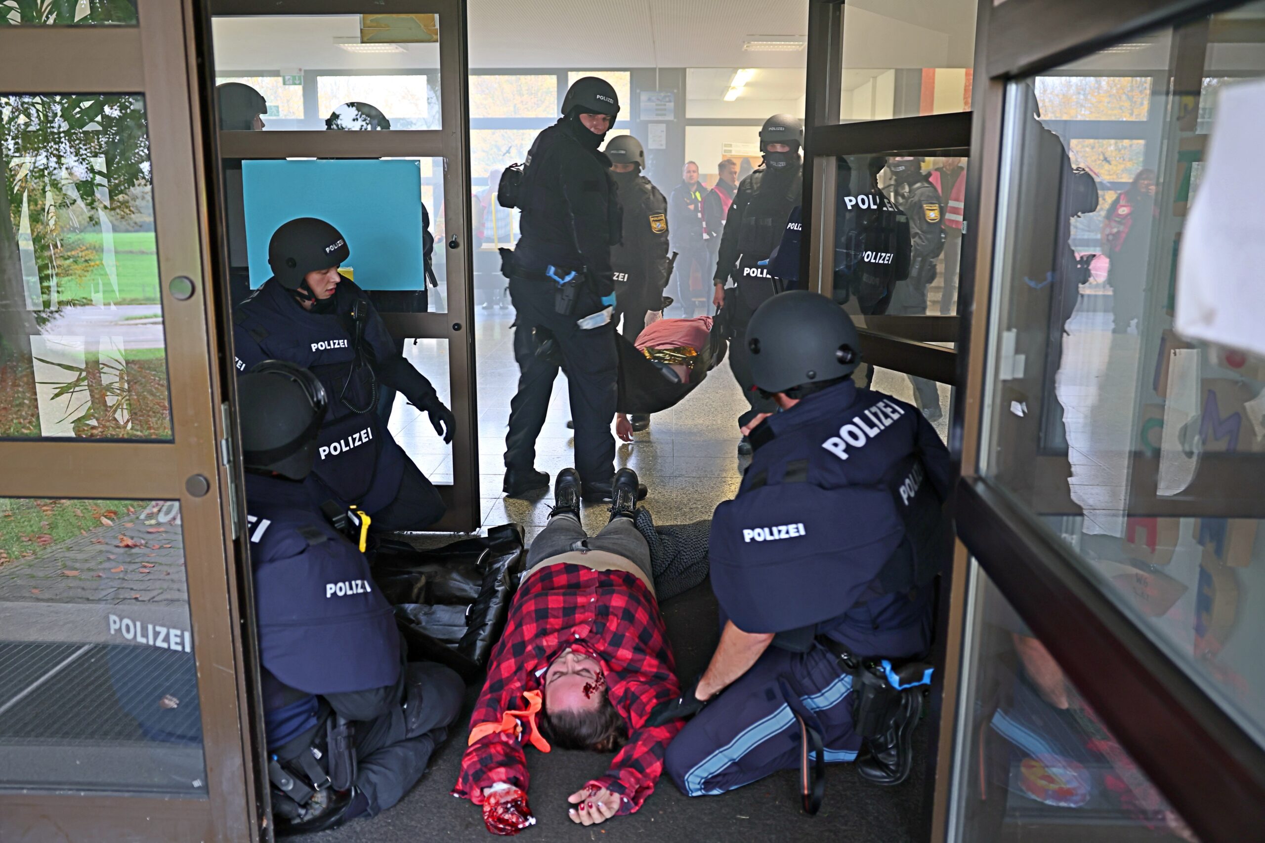 Die Übung erfolgte an einem öffentlichen Schulgebäude und konzentrierte sich besonders auf die Kooperation zwischen Polizei und Rettungsdienst bei der Übergabe verletzter und evakuierter Personen.