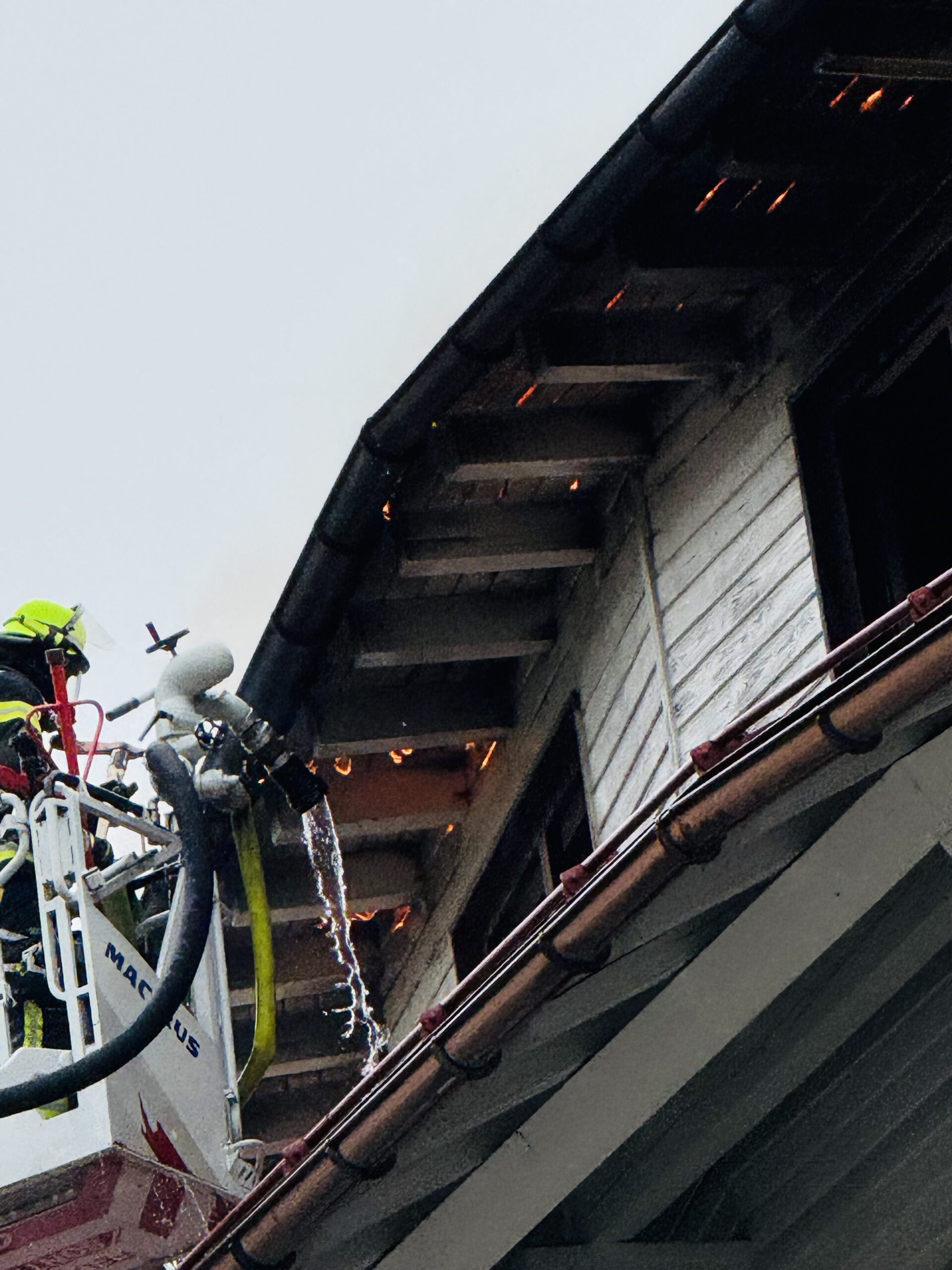 Löschwasser wurde über einen Bach und ein Sammelbecken bereitgestellt. Feuerwehrkräfte löschten über die Drehleitern der Feuerwehren aus Sonthofen und Oberstdorf unter das Dach hinein. Immer wieder loderten aber Flammen auf.