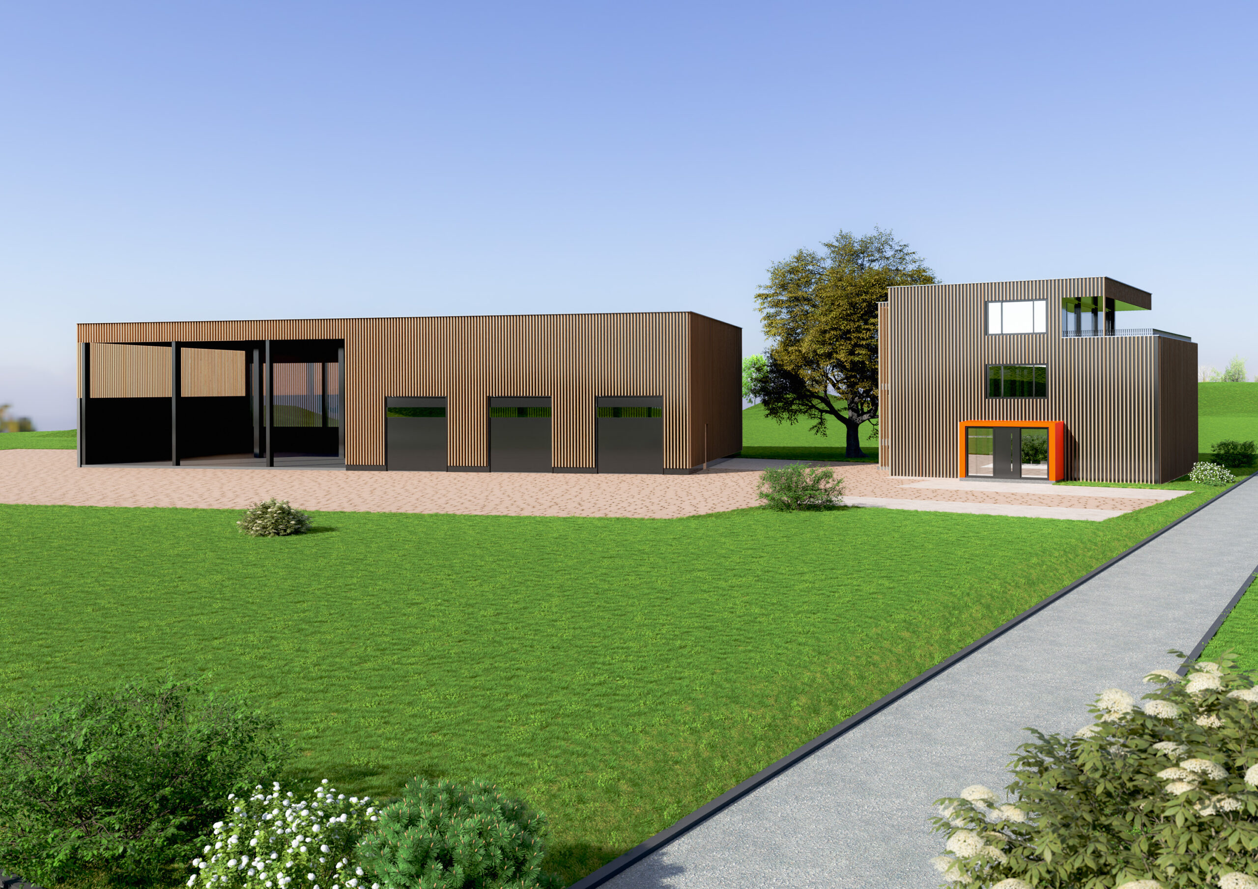 Am neuen Standort entstehen Büro- und Hallenflächen: Der etwa 425 m2 große Bürokomplex ist für insgesamt 25 Mitarbeitende ausgelegt und die rund 800 m2 große Halle bietet Platz für Gerätschaften und Maschinen, die von dort aus auf die Baustellen in der Region kommen. Außerdem wird es eine 55 m2 große Terrasse geben. Der gesamte Neubau entsteht in Holzbauweise. „Uns war besonders wichtig, dass unsere Mitarbeitenden einen schönen Arbeitsplatz in Leutkirch bekommen und dass sich der unser Neubau gut in die Allgäuer Natur einfügt“, erklärt Wild.
