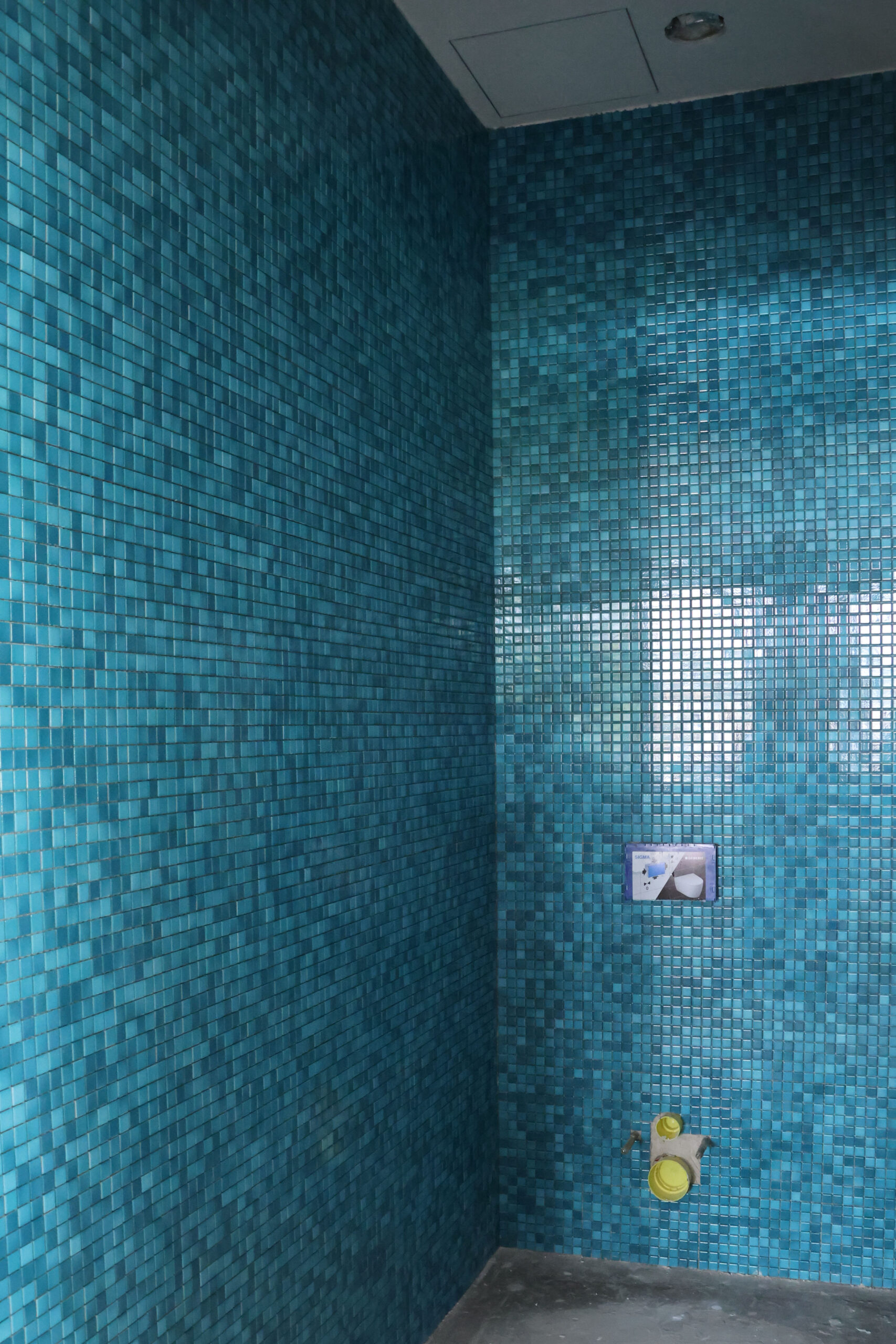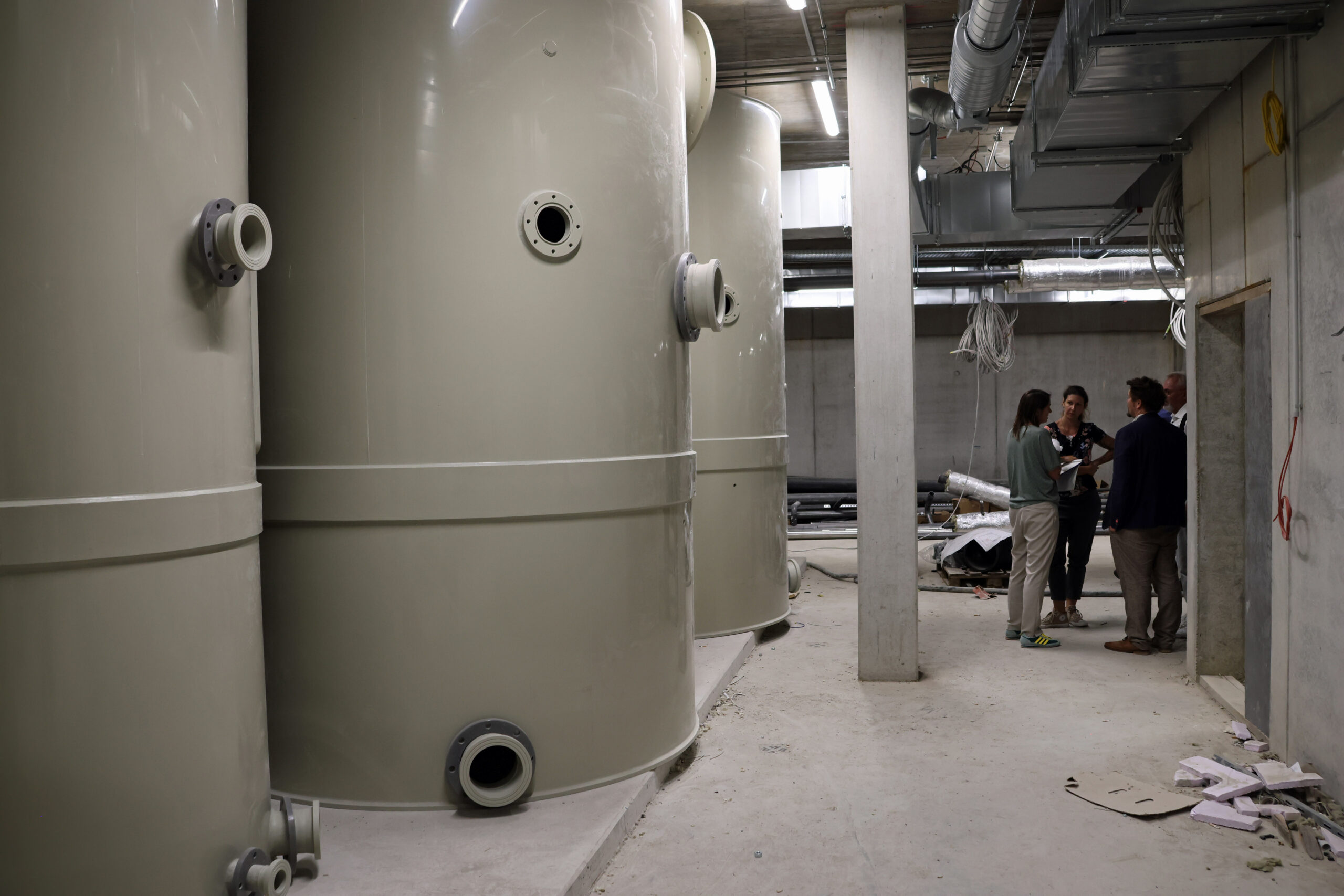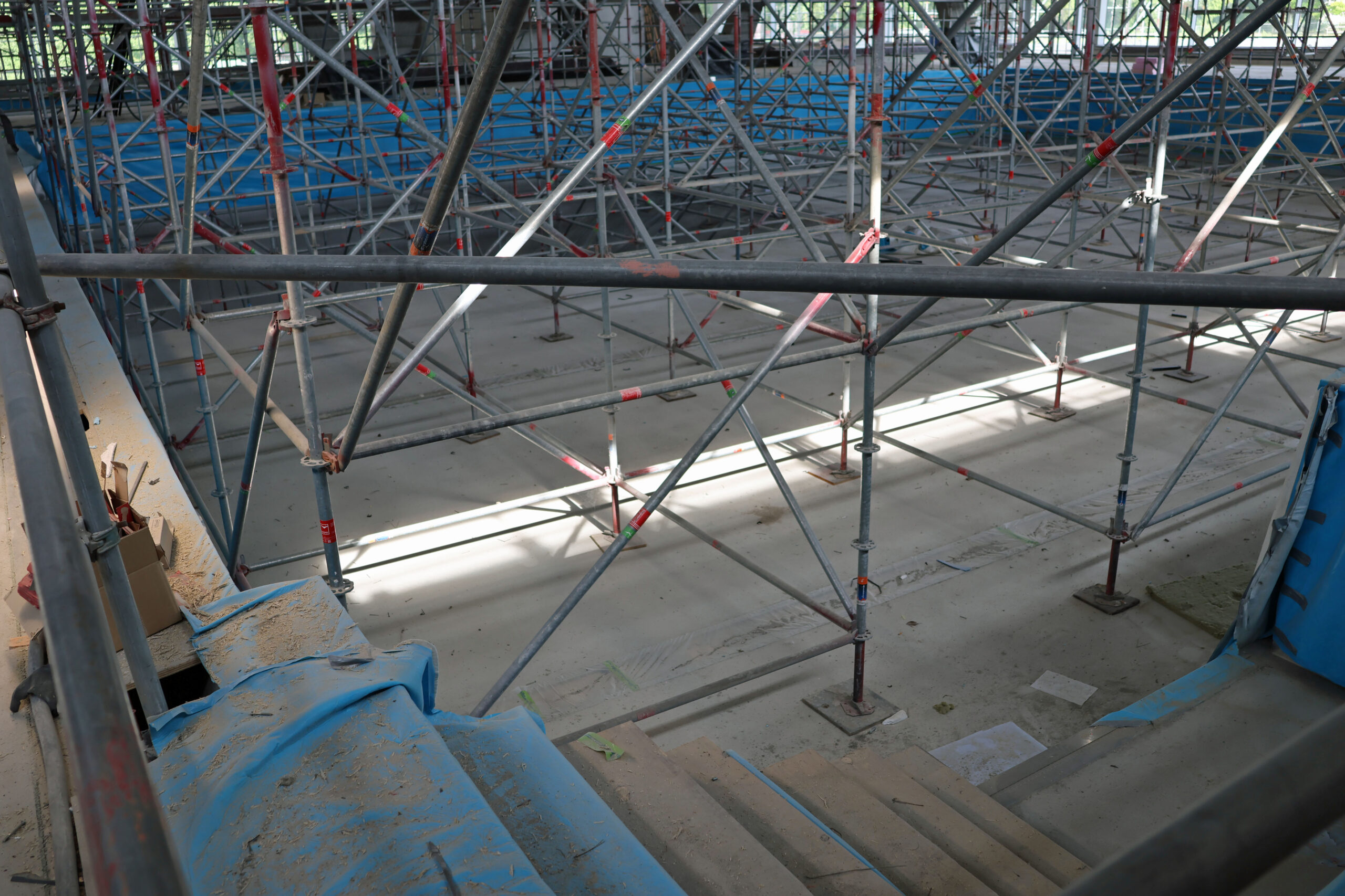Im Hallenbad selbst sind die Edelstahlbecken bereits eingebaut. Der Innenausbau läuft auf Hochtouren – die technischen Installationen sind weitgehend abgeschlossen, sodass Trockenbauwände geschlossen und abgehängte Decken montiert werden können. Auch der Estrich ist verlegt, und die Fliesenarbeiten haben begonnen.