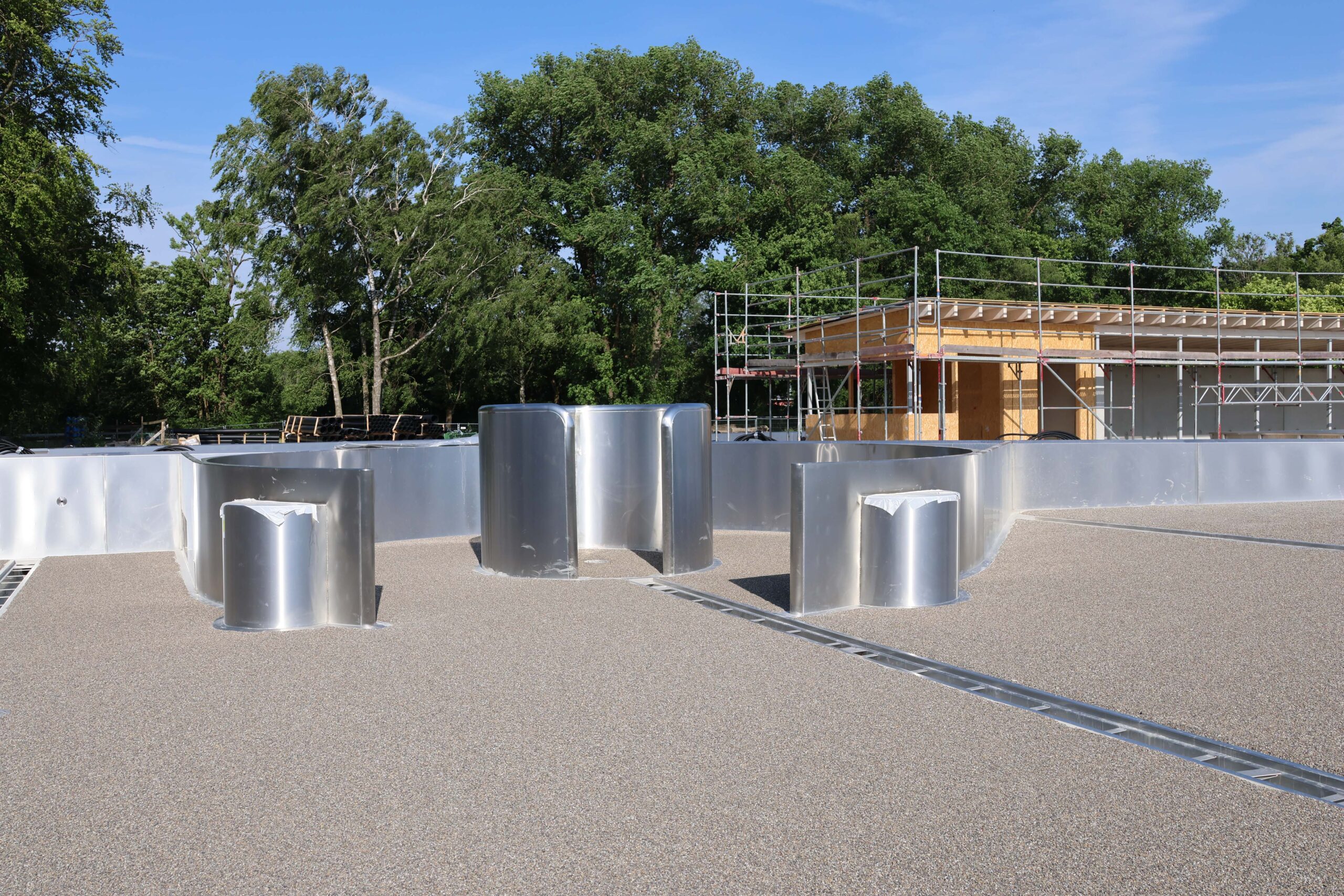 Im Freibadbereich wurden die Nebengebäude errichtet und weitgehend abgedichtet. Auch hier sind die Edelstahlbecken installiert. Aktuell werden Entwässerungs- und Rohrleitungsgräben im Außenbereich angelegt.