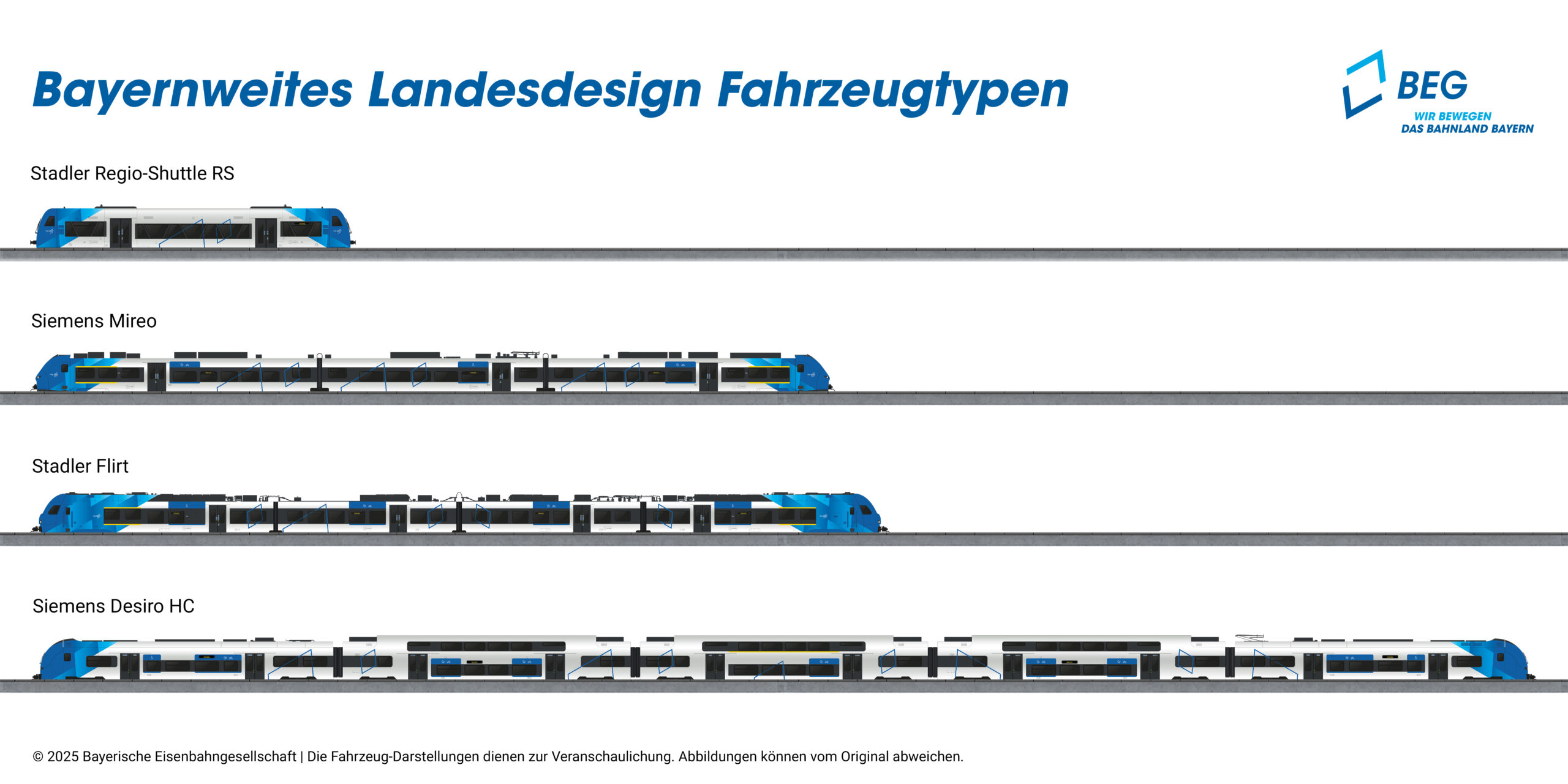 Die BEG fordert in ihren künftigen Ausschreibungen das Landesdesign für Neufahrzeuge. Die ersten Regionalzüge im neuen Look sollen Anfang des kommenden Jahrzehnts zwischen Aschaffenburg und Berchtesgaden unterwegs sein. Bei der Münchner S-Bahn kommen die ersten weiß-blauen Fahrzeuge ab Ende 2028 zum Einsatz. Bisher fahren die Nahverkehrszüge in Bayern im Design der jeweiligen Eisenbahnverkehrsunternehmen. Bestehende Fahrzeuge werden aus wirtschaftlichen Gründen nicht nachträglich umgestaltet. Das Landesdesign fügt sich nahtlos in die aktuelle Strategie des Freistaats ein, alle Kontaktpunkte, an denen die Fahrgäste mit dem bayerischen SPNV in Berührung kommen, einheitlich zu gestalten. Dazu zählen zum Beispiel auch Fahrausweisautomaten, Videoreisezentren und Kundencenter.
