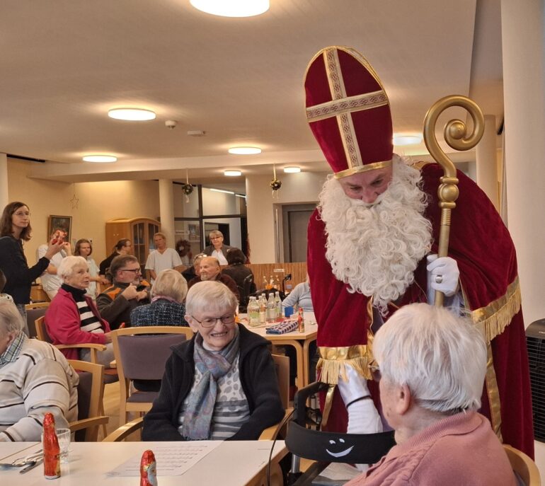 Ein weiteres Highlight des Besuchs war der Nikolaus, der die fröhliche Runde besuchte. Schon beim ersten Klingeln seiner Glocke war die Aufregung bei den Kindern groß, aber auch die Senioren freuten sich über den festlichen Besuch. Der Nikolaus hatte für jeden Anwesenden ein kleines Präsent dabei: einen Schokoladen-Nikolaus, der von allen freudig entgegengenommen wurde. Die Geschenke sorgten für strahlende Gesichter und kleine Überraschungsmomente, die diesen Tag unvergesslich machten.