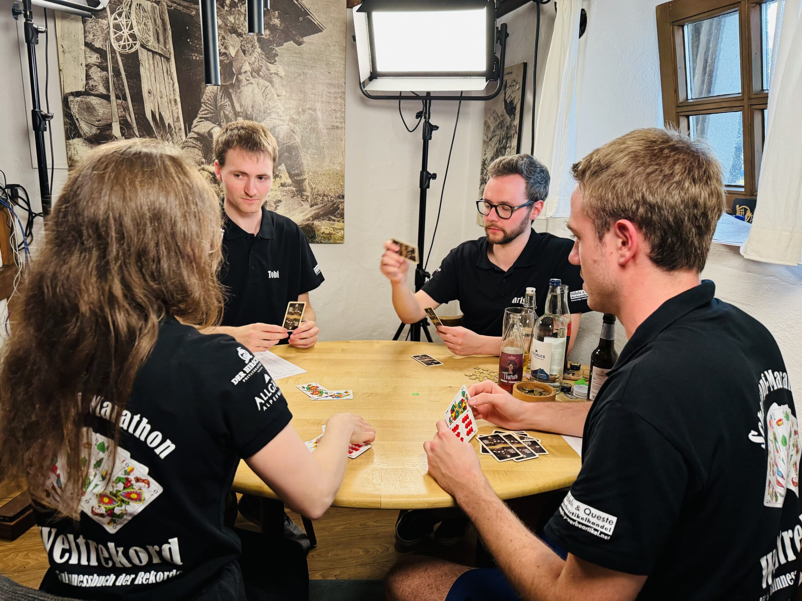 Viel mehr als 15 Stunden Schlaf waren für Gerry Krenn, Theresa und Claudia Braunmüller, Christian Blanz, Tobias und Markus Huber nicht drin, doch am Ende waren sie stolz auf ihre Leistung. Abwechselnd hatten sie die 192 Stunden durchgespielt – pünktlich um 16 Uhr machten sie nicht Schluss, sondern spielten sogar noch mehrere Partien weiter. Möglich gemacht hat dies auch der Wirt des Gasthof Adler in Sonthofen, Kilian Zuber. Er sperrte seine Wirtschaft nicht nur auf, sondern für den Rekord gar nicht mehr zu. Als die Zeit vorbei und die letzte Partie gespielt war, gab es aber kein Halten mehr. Großer Jubel bei den Protagonisten am Kartentisch, in der Wirtschaft und davor. Zahlreiche Interessierte hatten sich auf den Weg zum Gasthof Adler in die Sonthofer Fußgängerzone gemacht, um den Weltrekord zumindest aus der Nähe verfolgen zu können.