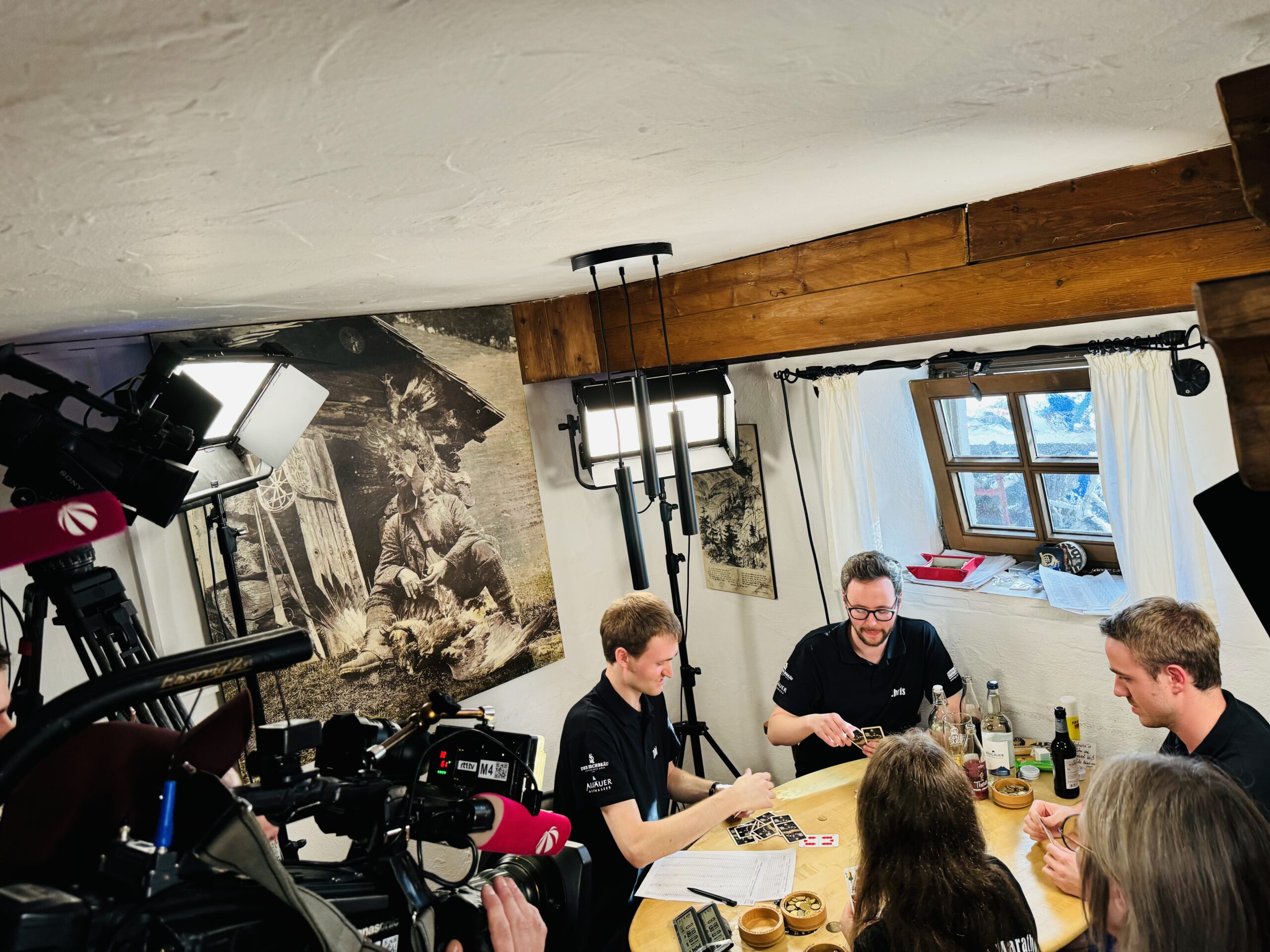 Und auch die Medienvertreter kamen in Scharen: Zeitungen, Fernseh- und Radiosender kamen teils von weither, um den Schafkopfwettbewerb in die Welt hinaus zu tragen. In engen Verhältnissen am gut ausgeleucheten Schafkopftisch versuchten BR Fernsehen, Sat.1 Bayern und RTL die besten die Bilder für ihrer Zuseher einzufangen.