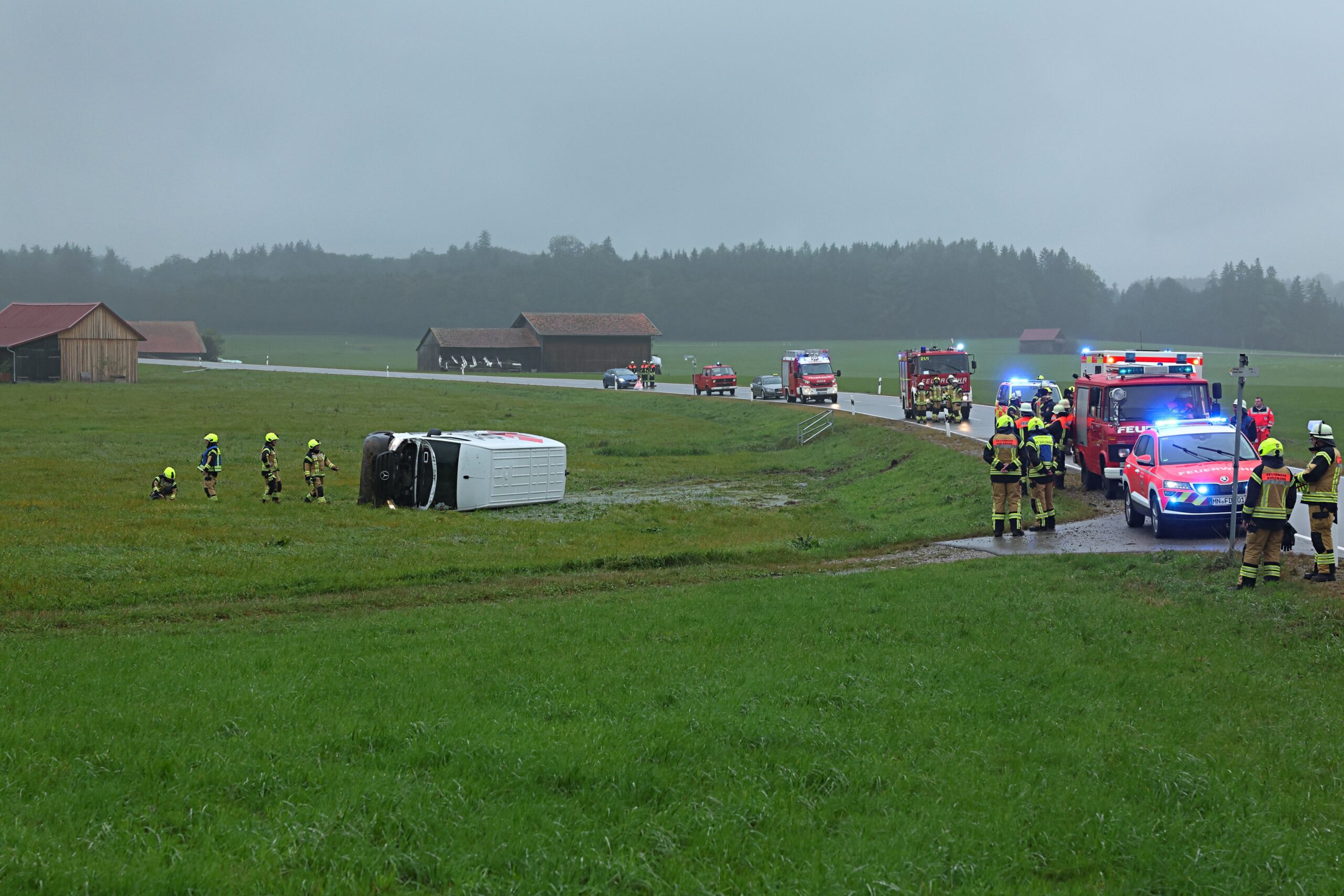 Aufgrund der Notrufmeldung alarmierte die Integrierte Leitstelle (ILS) Donau-Iller umgehend Notarzt und Rettungswagen aus Mindelheim. Zur Sicherstellung der Unfallstelle und der Bergung des Fahrzeugs wurden die Feuerwehren Unteregg, Dirlewang und Markt Rettenbach hinzugezogen. Beamte der Polizeiinspektion Mindelheim nahmen den Unfall auf und kümmerten sich um die weitere Ermittlung des Hergangs.