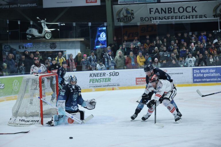 Mit dem Rücken zur Wand waren die Buchloer nach dem2:3 Serienrückstand vor diesem sechsten Duell am Freitagabend gestanden, in dem die Gäste mit einem Sieg die Serie hätten vorzeitig beenden können. Doch wie in bisher allen Partien zuvor sollte auch an diesem Abend am Ende das Heimteam die Nase vorne haben, wonach es zu Beginn aber nicht unbedingt aussah. Denn den Buchloer merkte man anfangs doch spürbar den immensen Druck des „gewinnen müssens“ an, der auf den Schultern der Freibeuter lastete. So kamen die Gäste besser ins Spiel und hatten in den ersten zehn Minuten gleich vier hochkarätige Chancen auf den Führungstreffer. Doch ein wieder einmal zuverlässiger Rückhalt Dominic Guran im ESV-Tor verhinderte mit starken Paraden den Rückstand. Und dann schlugen plötzlich die Piraten zu: Als die Hausherren gerade eine Unterzahl überstanden hatten, schickte Alexander Krafczyk den von der Strafbank zurückkehrenden Michal Petrak mustergültig auf die Reise und der tschechische Routinier behielt vor ECP-Tormann Justin Köpf die Nerven und traf zum 1:0 (13.) – zugleich auch der Pausenstand nach 20 Minuten.