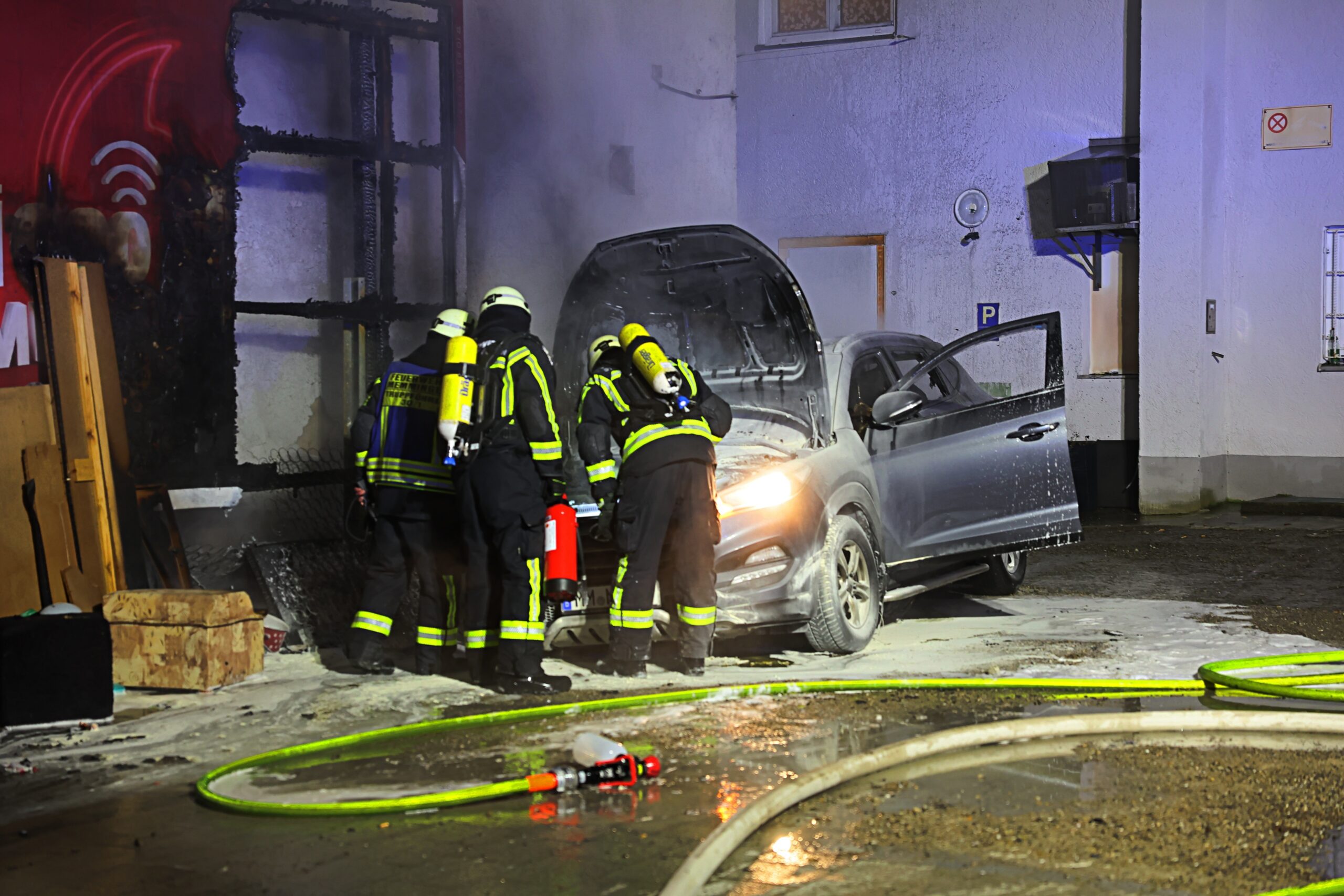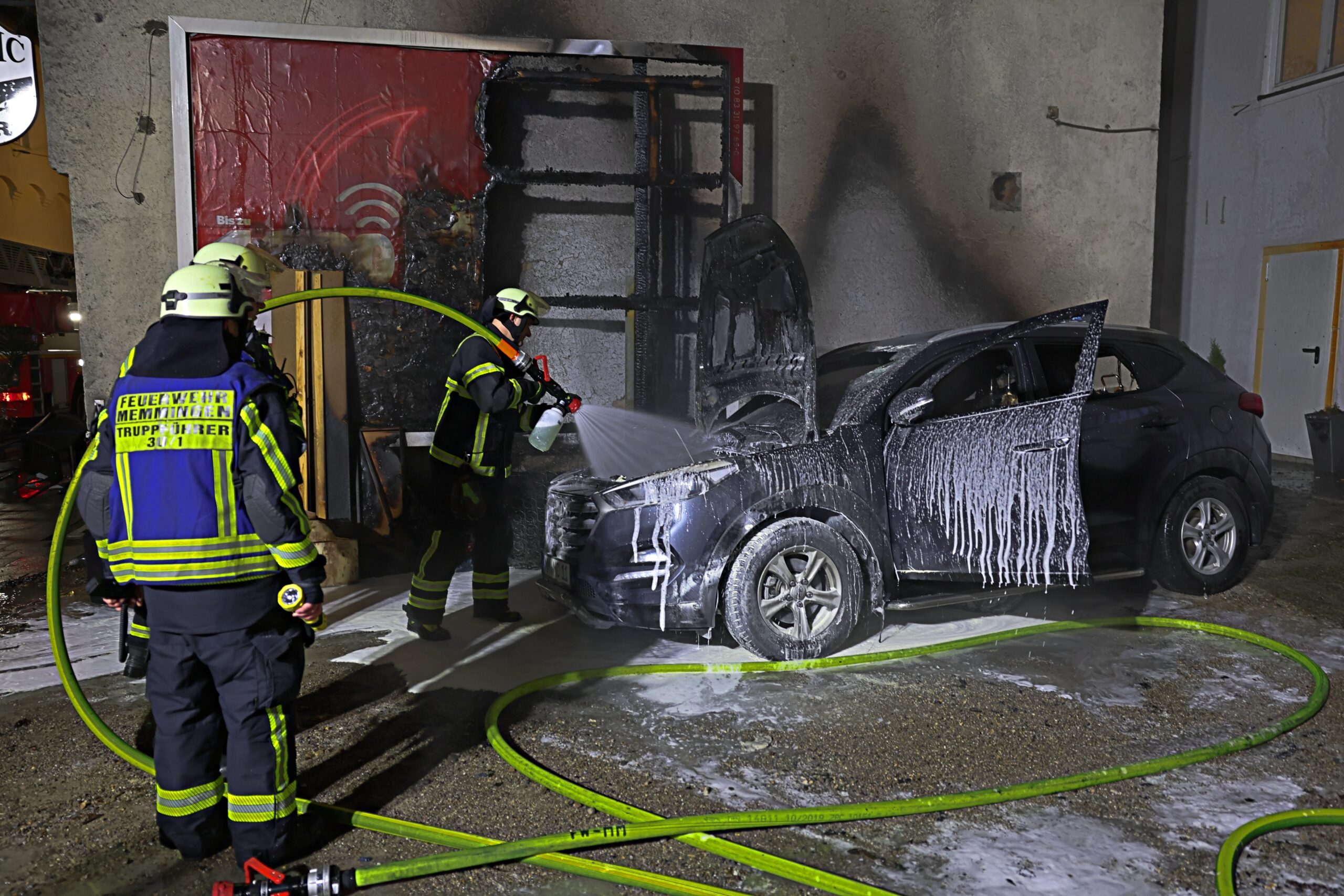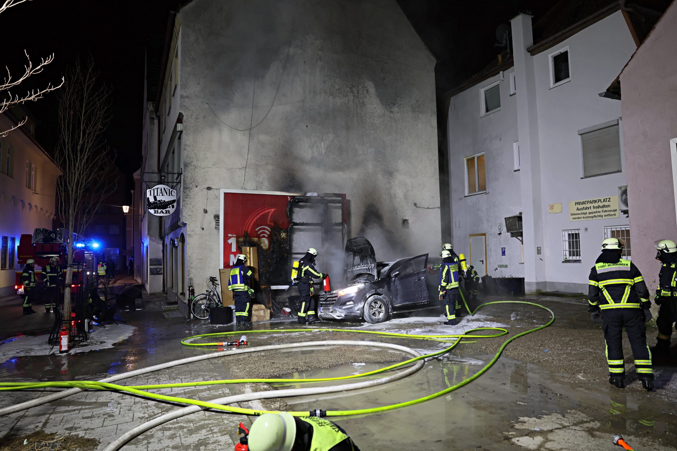 In den frühen Morgenstunden des 3. Februar 2025 kam es in der Memminger Innenstadt zu einem Brand an einem abgestellten Pkw. Die Flammen breiteten sich schnell aus und zerstörten das Fahrzeug fast vollständig. Zudem wurde ein großes Werbeplakat durch das Feuer beschädigt.