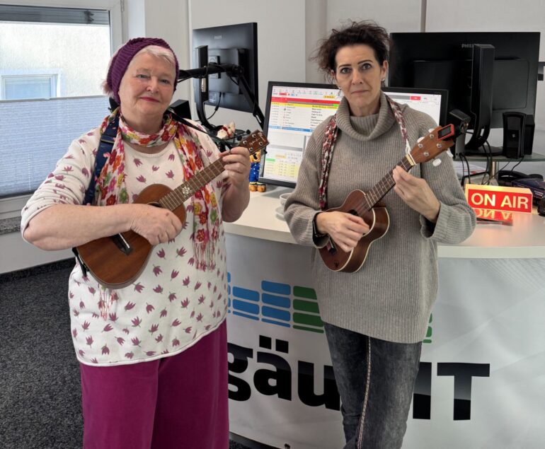 Bildunterschrift: Birgit Klügel vom Ukulelen-Stammtisch Allgäu und Moderatorin Marion Daltrozzo // Foto: AllgäuHIT