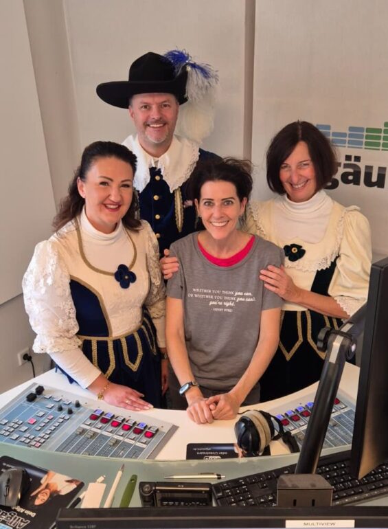 Bildunterschrift: Linda I., Marc I und Sylvia I. von der TEZ – der Traditionsgemeinschaft der ehemaligen Zunftmeister Sonthofen und Moderatorin Marion Daltrozzo // Foto: AllgäuHIT