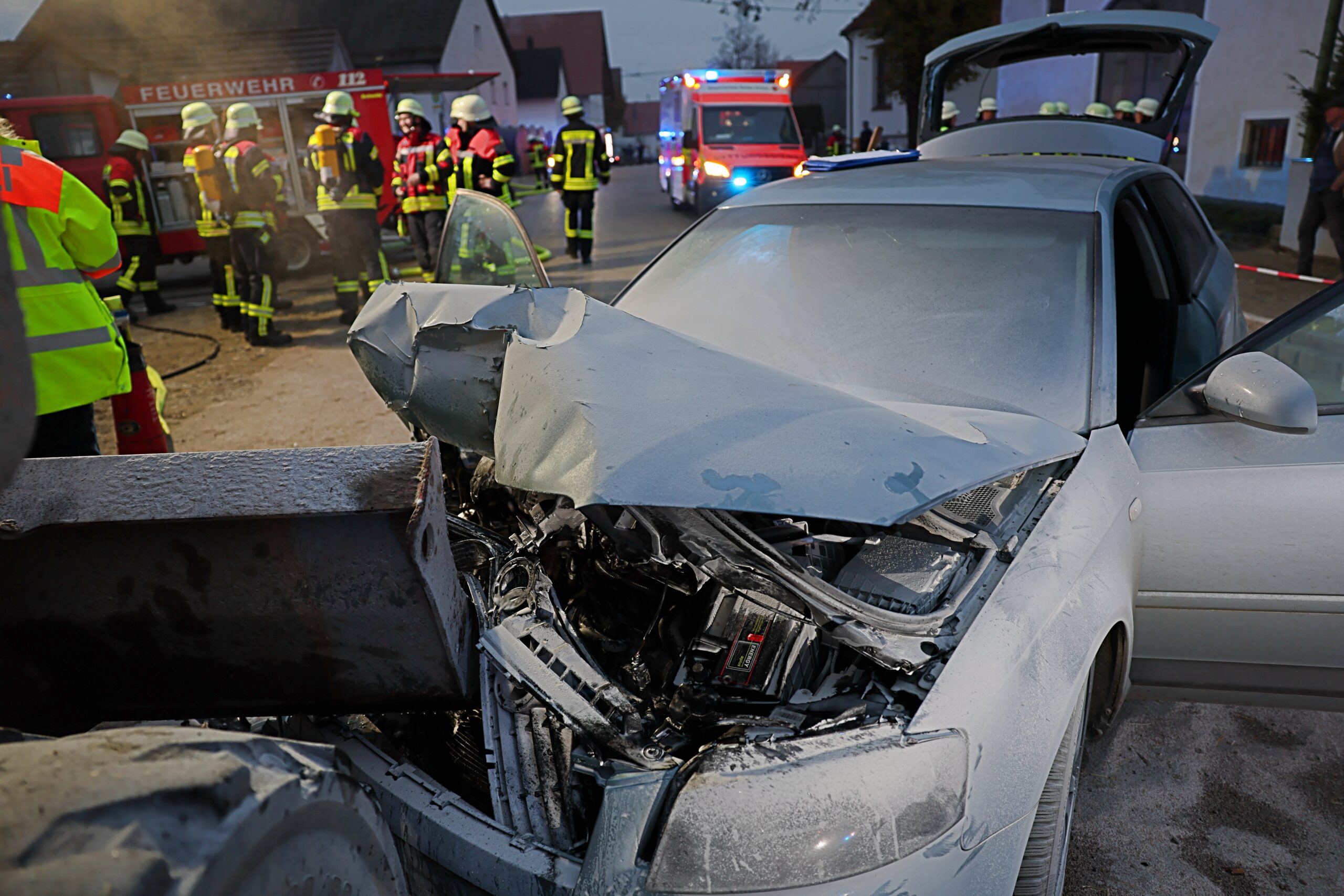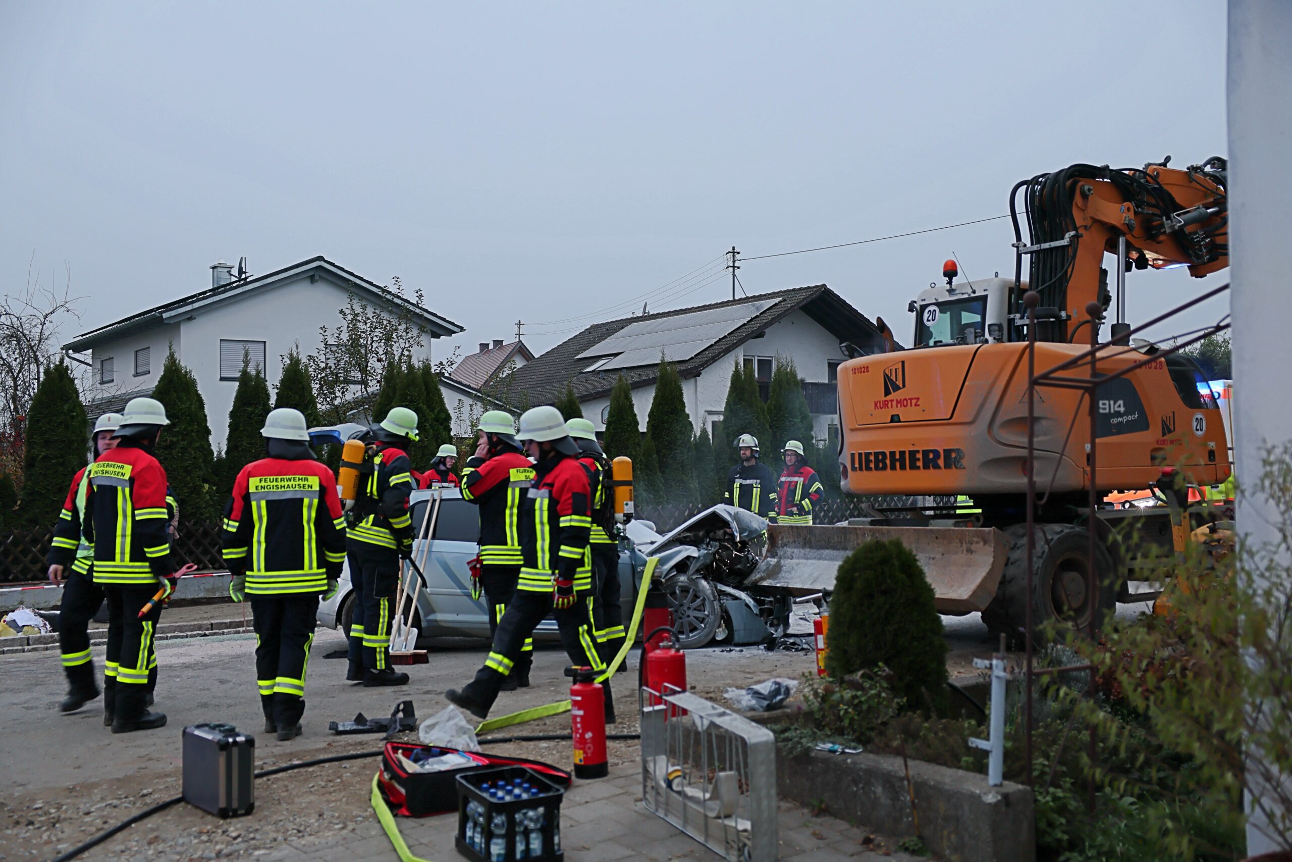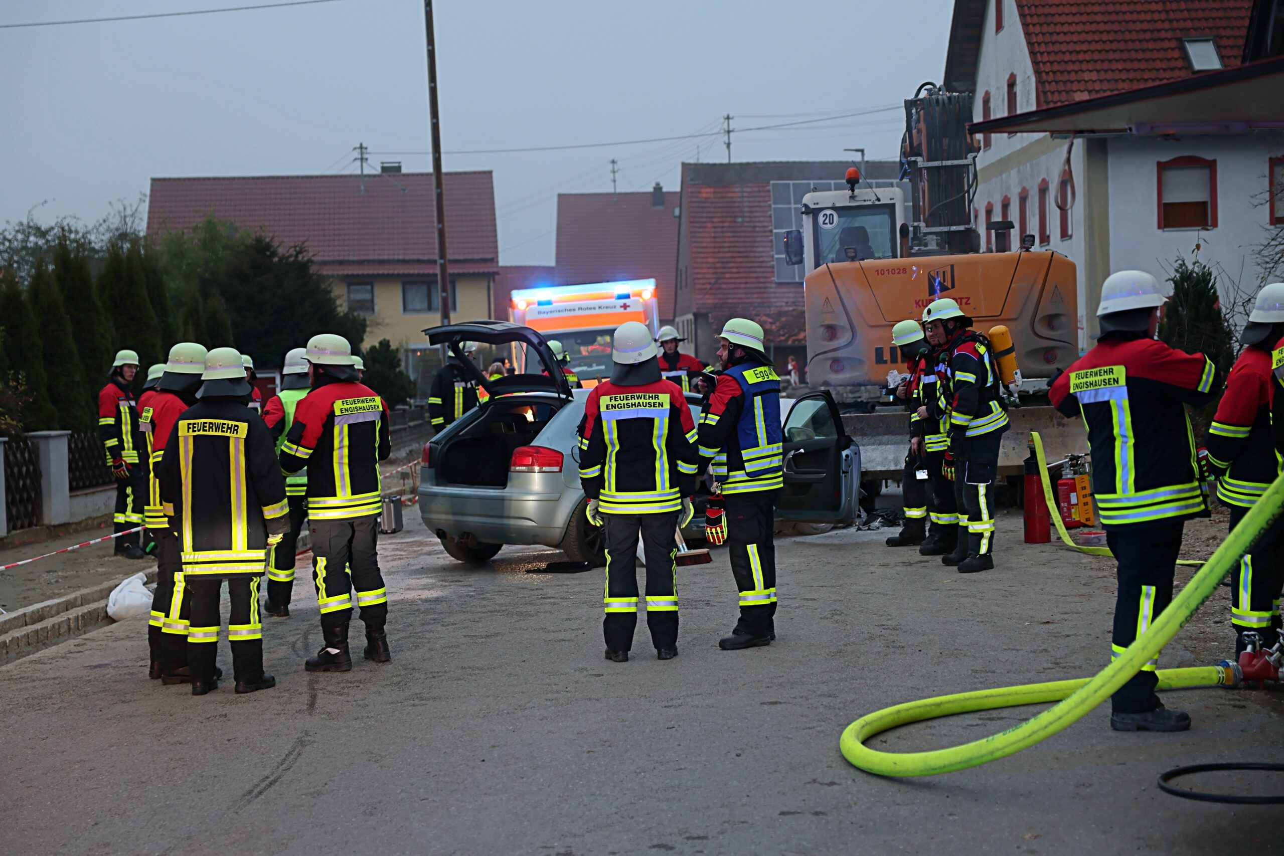In der Ortsdurchfahrt von Engishausen ist ein Auto mit zwei Insassen in der Nacht ungebremst gegen einen abgestellten Bagger geprallt. Durch den Aufprall fing das Auto Feuer, noch während sich die Insassen im Fahrzeug befanden.