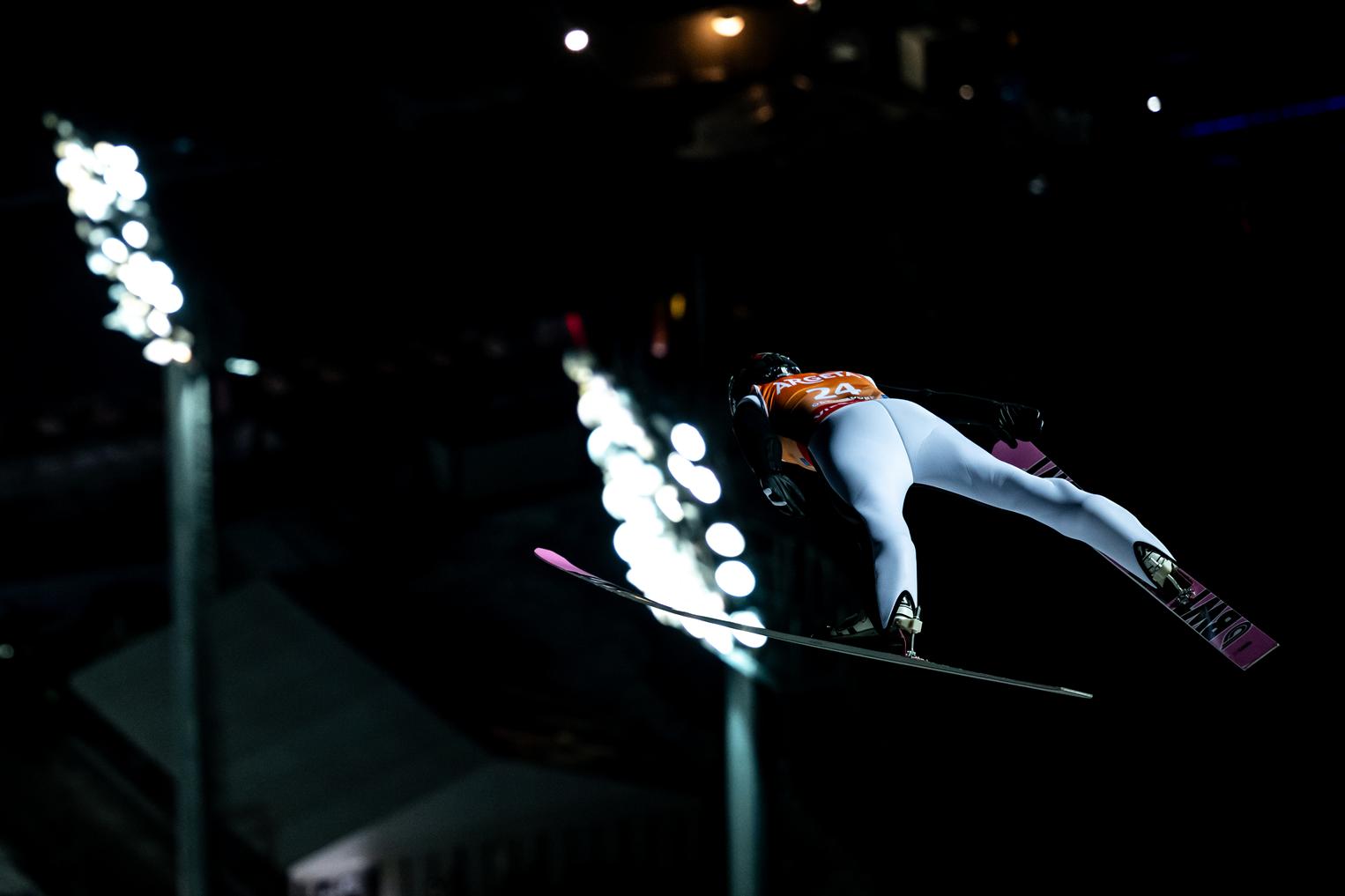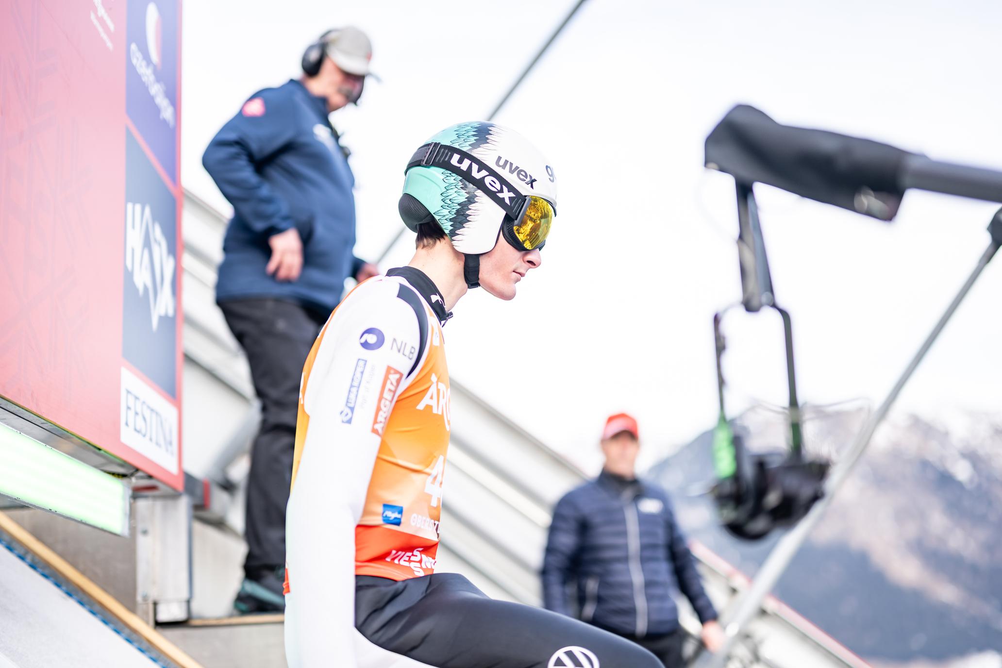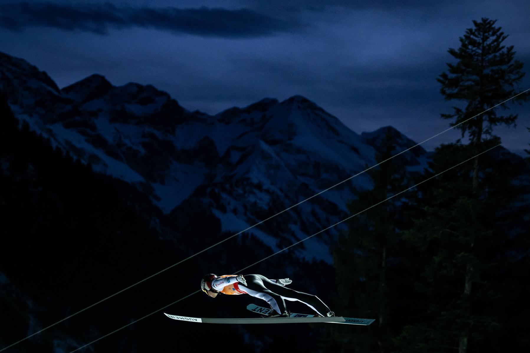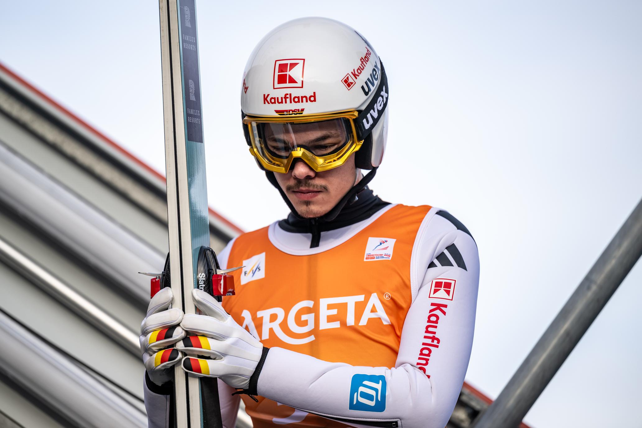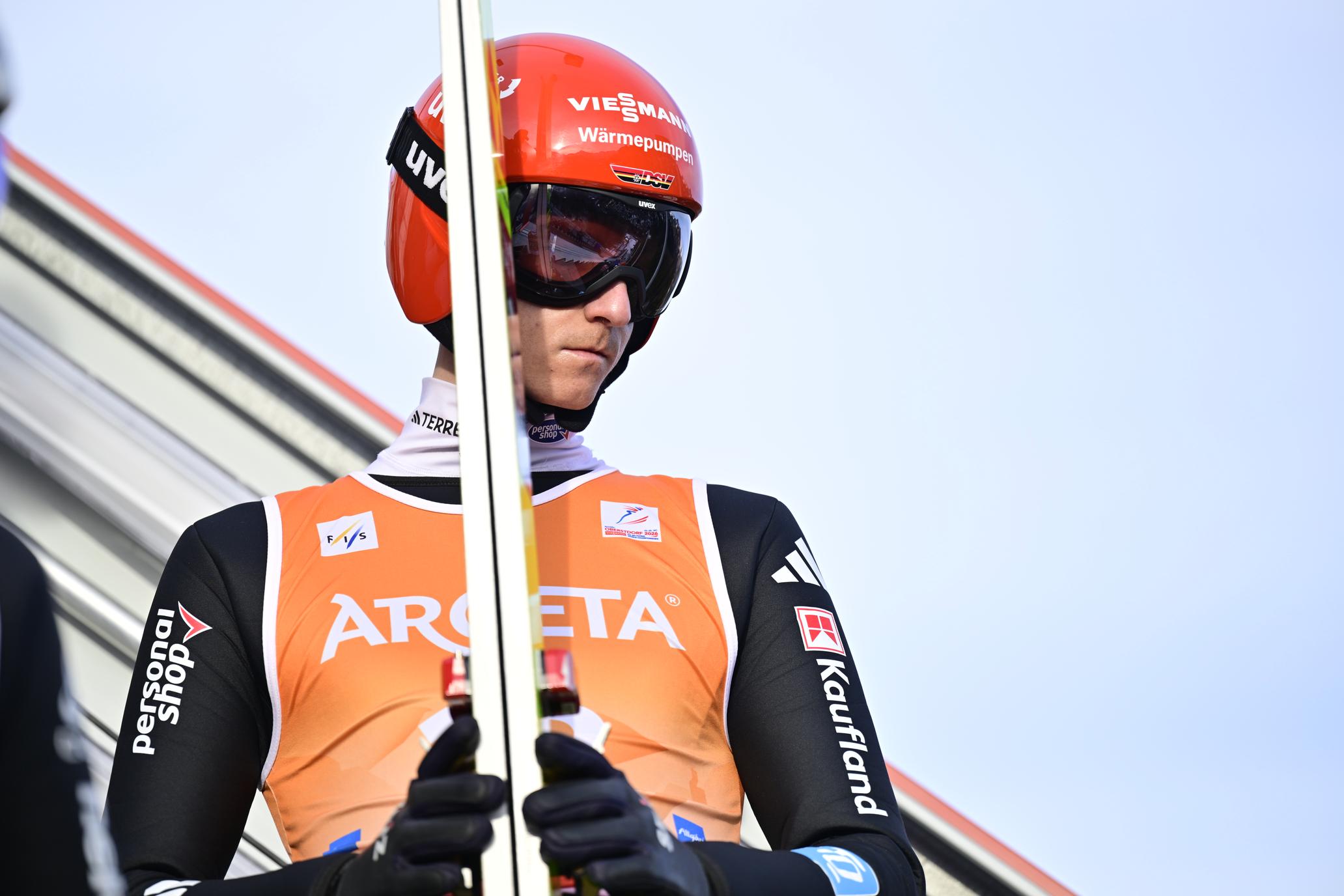Der Oberstdorfer Karl Geiger lieferte gute Sprünge ab, hatte beim zweiten Wettkampfsprung des Tages aber Pech mit den Bedingungen / Foto: Dominik Berchtold