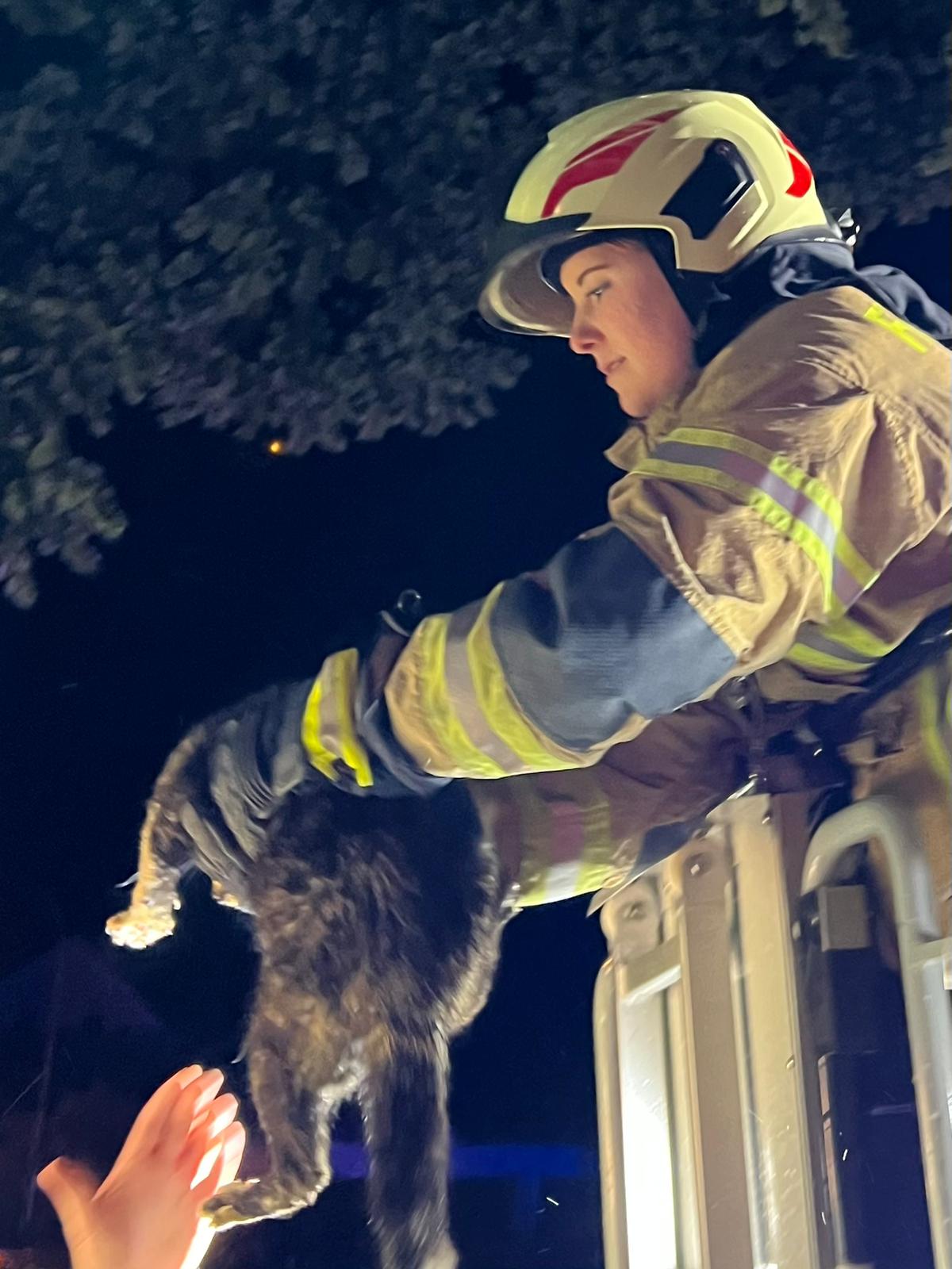 Ein besonderer Einsatz betraf eine hilflose Katze, die sich während des Sturms auf einem Baum nicht mehr heruntertraute. Der Besitzer wandte sich persönlich an die Feuerwehr, die die Drehleiter einsetzte und das Tier sicher zu Boden brachte.