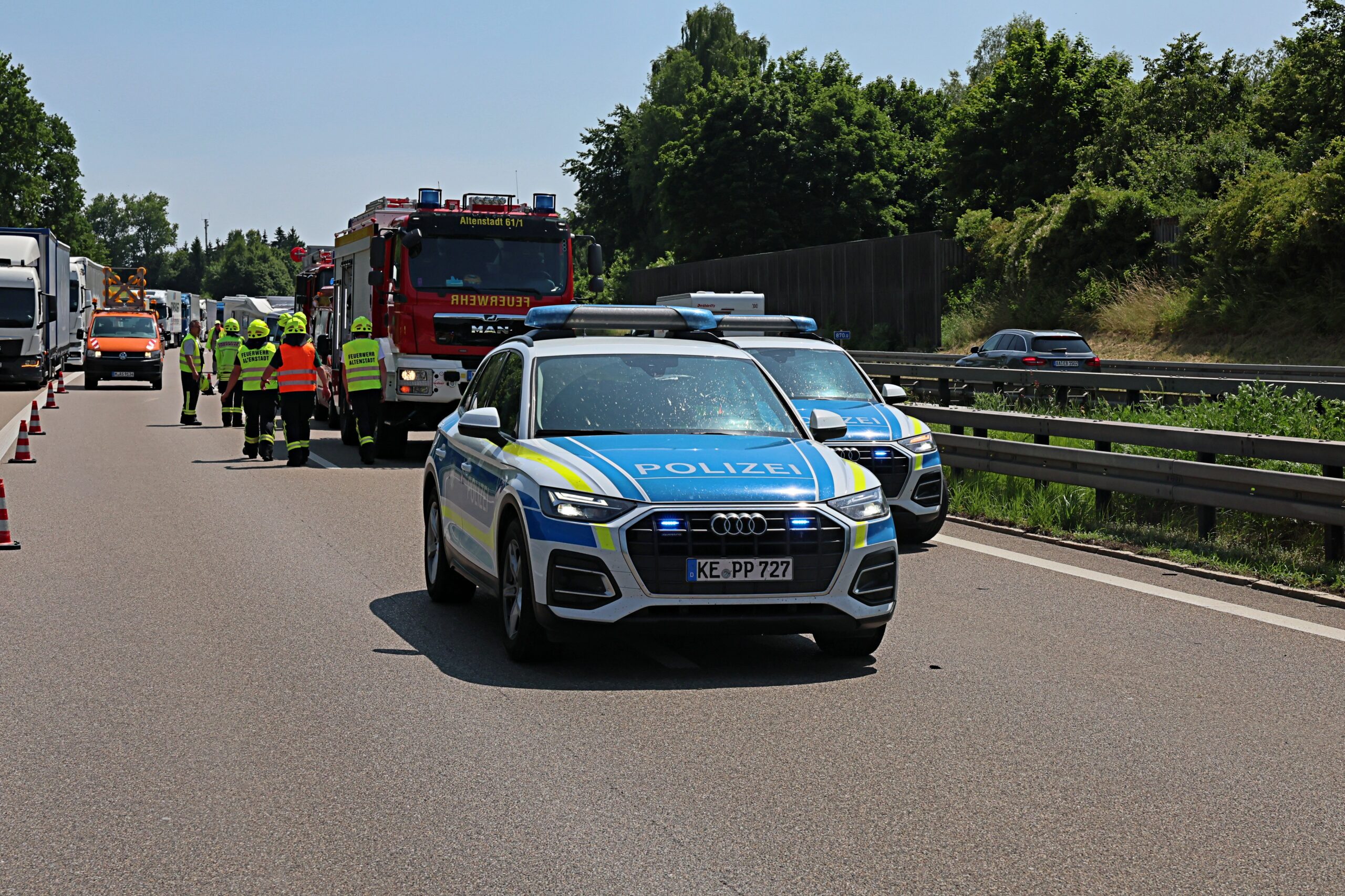 Die 44-jährige Fahrerin des Nissan sowie die drei weiteren Insassen blieben bei dem Unfall unverletzt. Die Autobahn musste zur Unfallaufnahme, Absicherung und Bergung der Fahrzeuge für etwa 1,25 Stunden in Richtung Norden komplett gesperrt werden. Der Verkehr wurde an der Anschlussstelle Altenstadt umgeleitet.