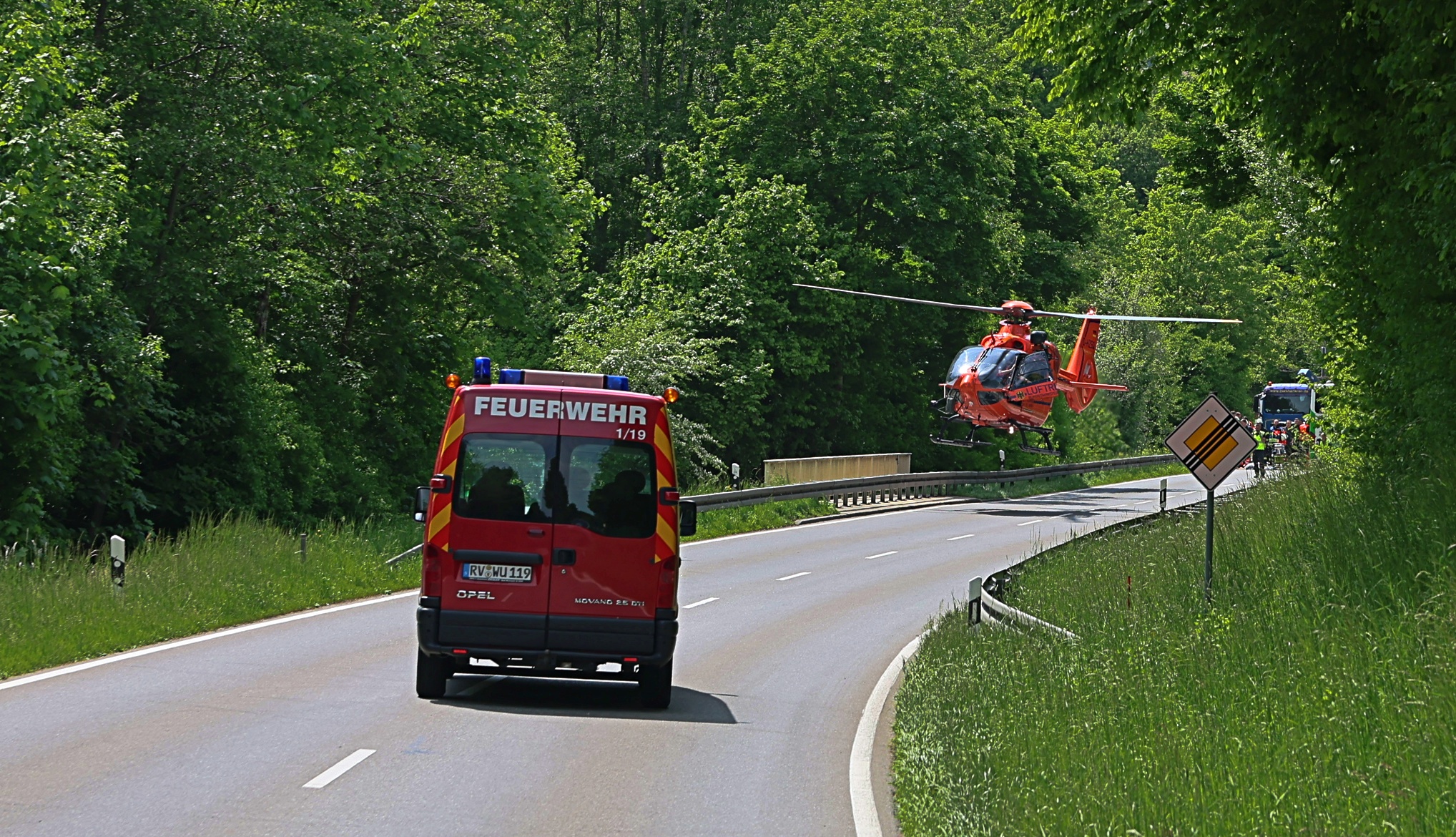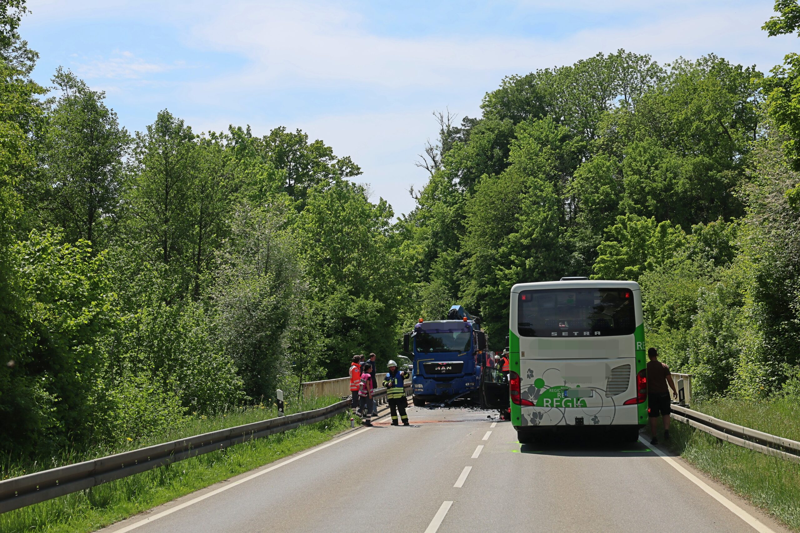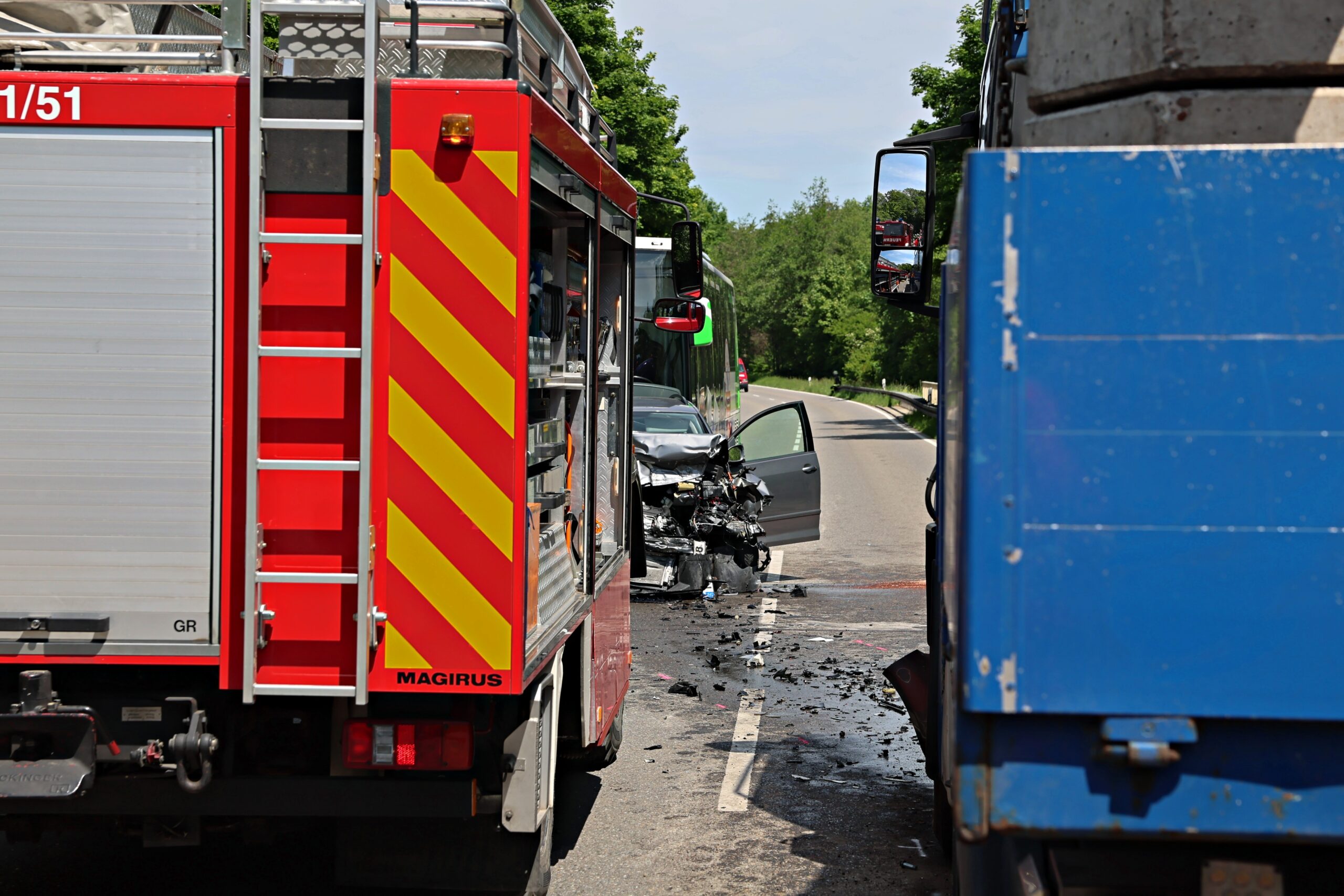 Durch den folgenden Frontalzusammenstoß wurde der VW Golf zurück auf seine Fahrbahn geschleudert, wo ihm der überholte Bus, in dem sich zum Unfallzeitpunkt außer dem 46-jährigen Fahrer keine weiteren Fahrgäste befanden, noch leicht auffuhr. Durch die Wucht der Kollision mit dem Lkw wurden der 87-Jährige sowie seine 88-jährige Beifahrerin in dem Wagen eingeklemmt und mussten von der alarmierten Feuerwehr mit technischem Gerät befreit werden. Während die Frau trotz notärztlicher Bemühungen noch an der Unfallstelle verstarb, wurde der 87-Jährige in lebensbedrohlichem Gesundheitszustand mittels Rettungshubschrauber in ein Krankenhaus geflogen. Die beiden 26 und 40 Jahre alten Insassen des Lkw wurden nach derzeitigem Stand leicht verletzt und vom Rettungsdienst vorsorglich ebenfalls in ein Krankenhaus gebracht. Der Gesamtschaden an den drei beteiligten Fahrzeugen wird auf rund 30.000 Euro geschätzt. Für die Dauer der Einsatzmaßnahmen und die polizeiliche Verkehrsunfallaufnahme, für die auch ein Gutachter hinzugezogen wurde, wurde die L 314 im Bereich der Unfallstelle voll gesperrt.