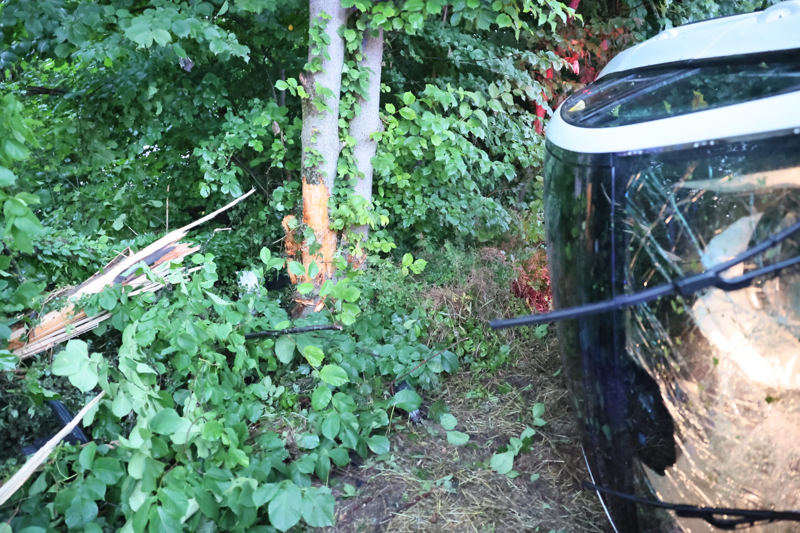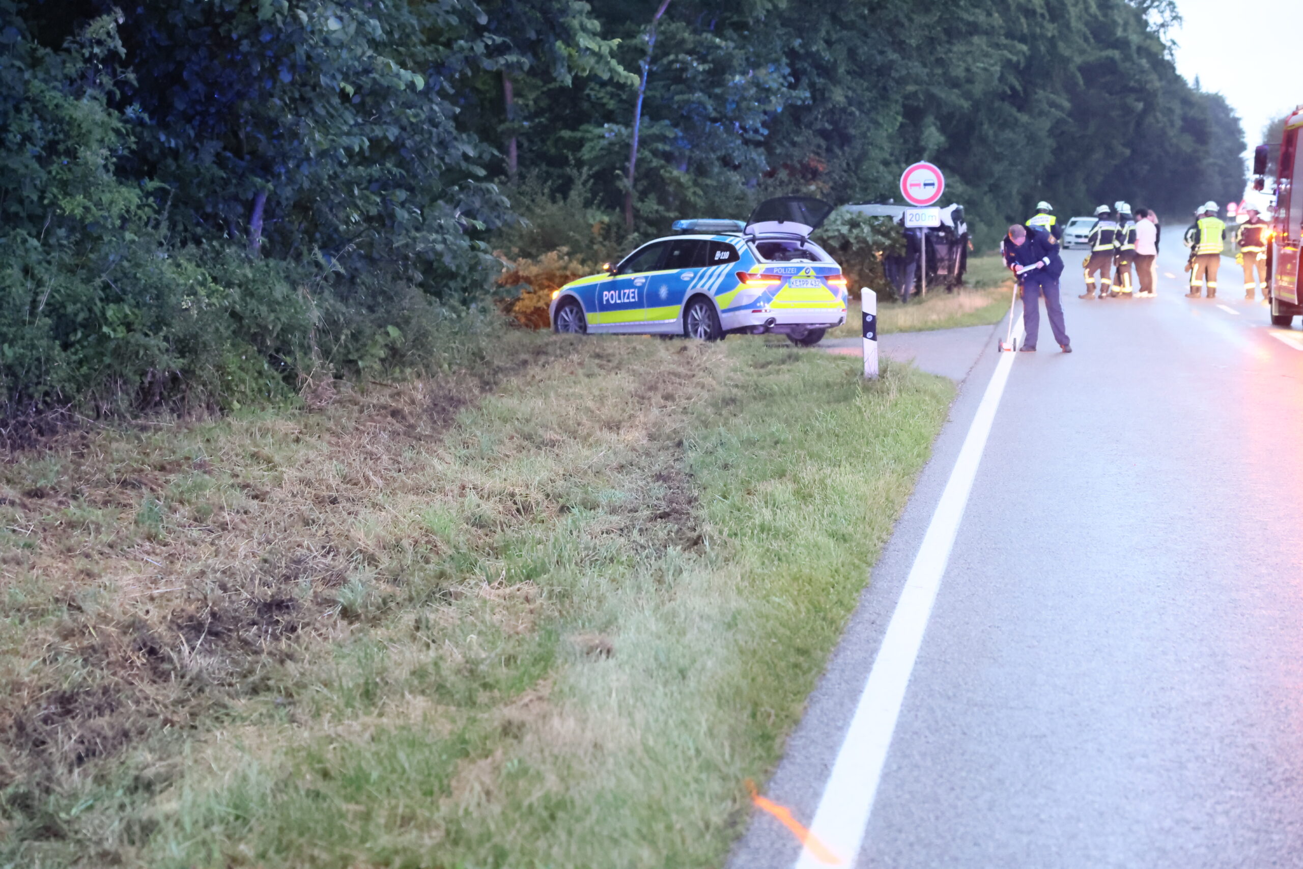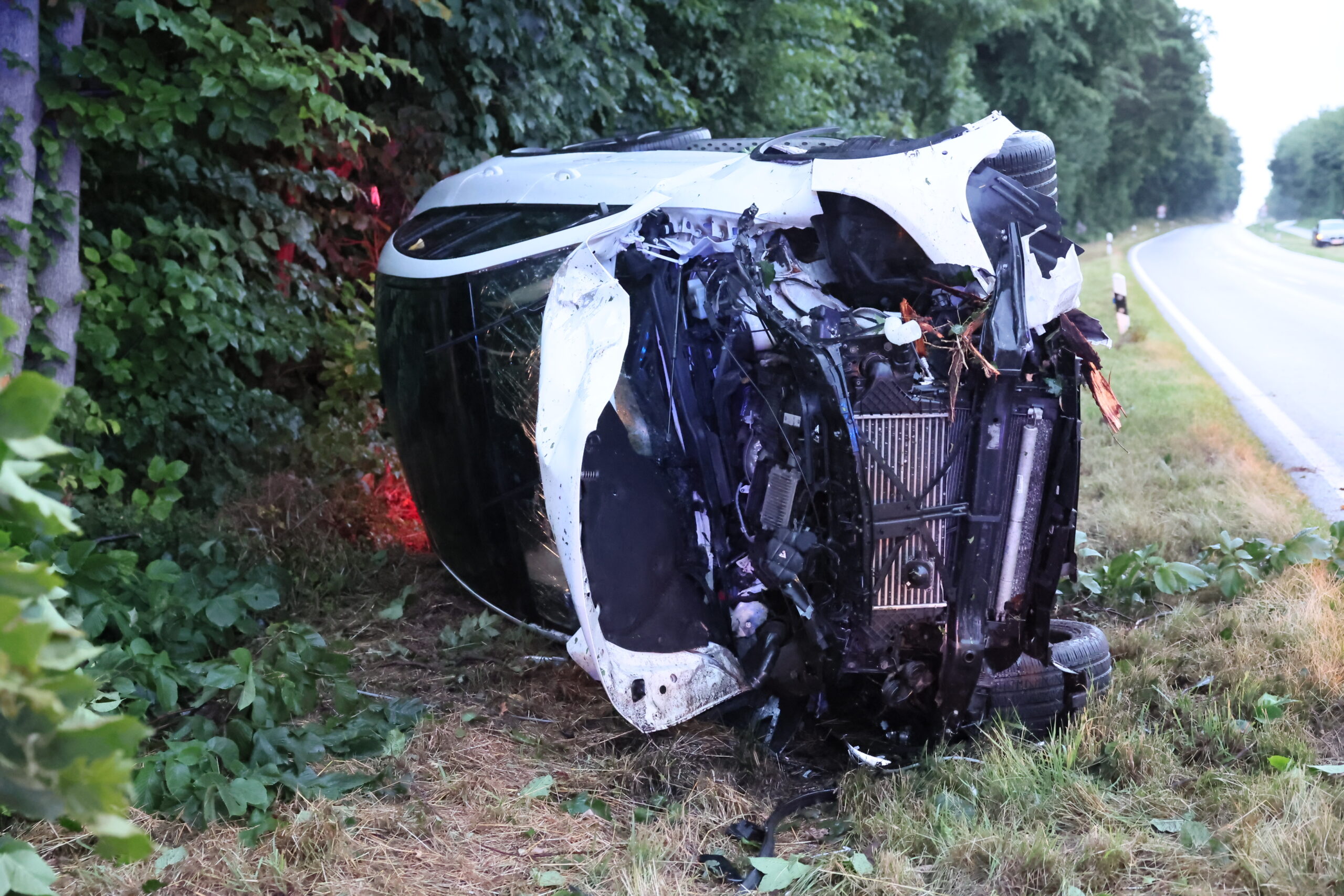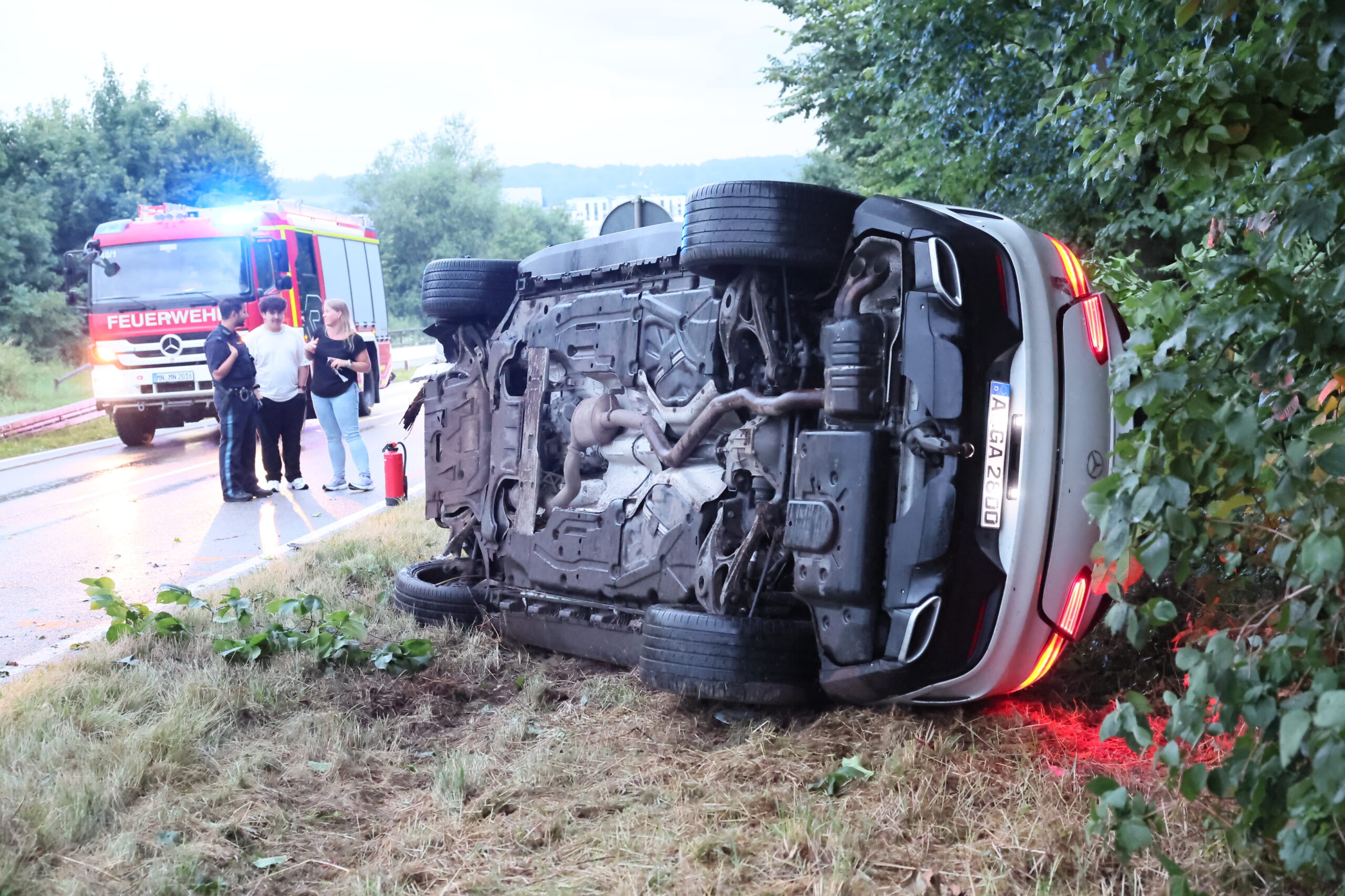 Vermutlich aufgrund nicht angepasster Geschwindigkeit geriet der Pkw ins Schleudern, kam nach links von der Fahrbahn ab und überschlug sich mehrfach im angrenzenden Grünstreifen. Das Fahrzeug streifte ein Gebüsch, prallte gegen einen Baum und kam schließlich seitlich in einer Böschung zum Liegen.