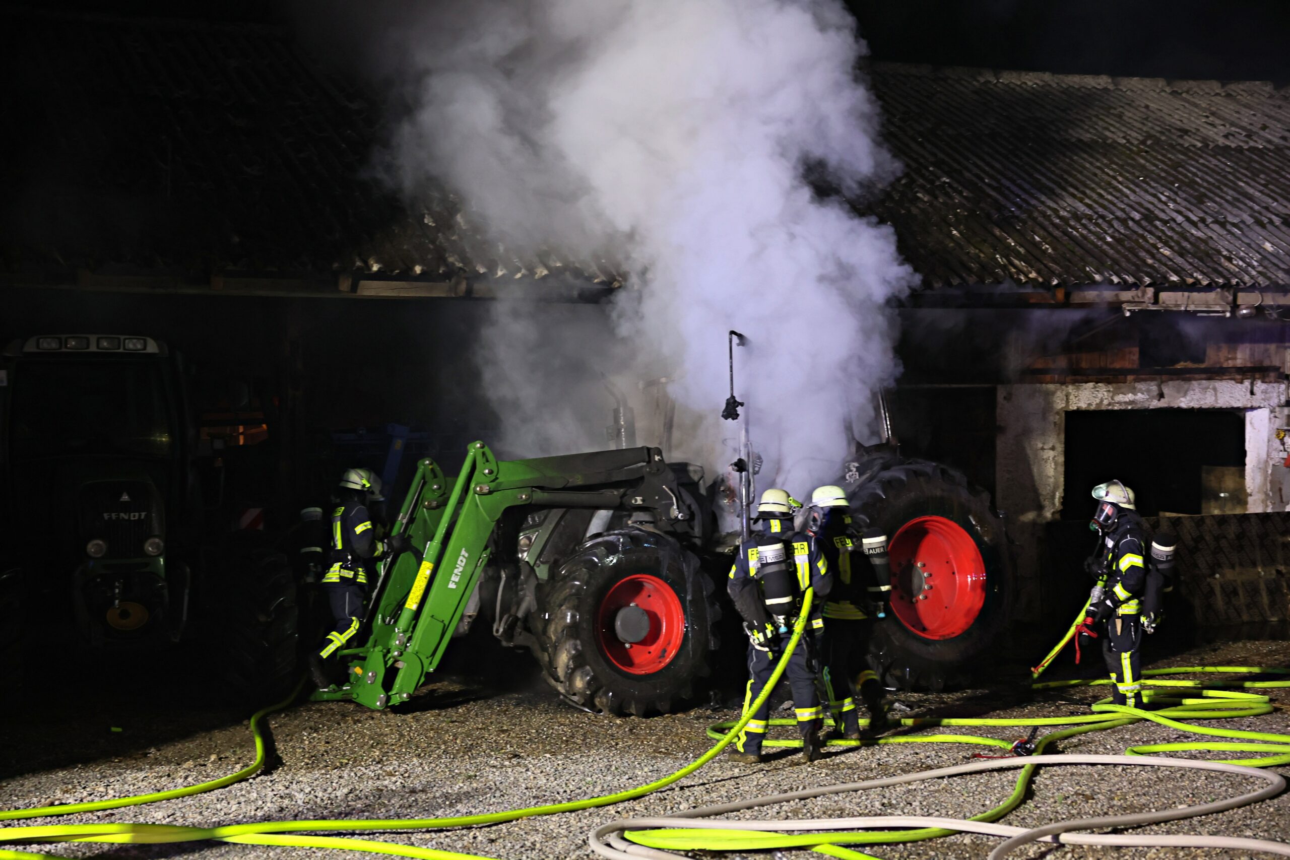 Ein aufmerksamer Nachbar bemerkte den dichten Rauch und alarmierte die Leitstelle über den Notruf 112. Beim Eintreffen der Feuerwehr Kirchhaslach stand der Traktor bereits in Vollbrand, die Flammen hatten sich auf den Dachstuhl der Stallung ausgebreitet. Der Einsatzleiter erhöhte daraufhin sofort die Alarmstufe auf B4.