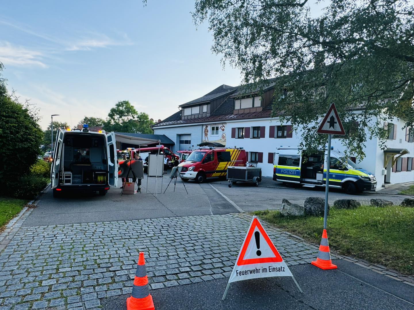 Seit heute Morgen kommt es in der Immenstädter Straße in Blaichach zu einem Großeinsatz von Feuerwehr, Rettungsdienst, Technischem Hilfswerk und Polizei. Im Gebäude einer Firma waren gefährliche Dämpfe ausgetreten. Aktuell geht die Polizei von einem Betriebsunfall aus, bei dem es aufgrund einer Leckage in einem Behälter (1.000 Liter) zu einem Austritt eines chemischen Stoffes gekommen ist. Dieser reagierte mit einem weiteren Stoff, wodurch gesundheitsschädliche Dämpfe entstanden. Ein Mitarbeiter verletzte sich dabei nach aktuellen polizeilichen Erkenntnissen mittelschwer. Er kam zur weiteren Behandlung in ein Krankenhaus. Drei weitere Personen im Nachbargebäude wurden durch den Gefahrenstoffaustritt leicht verletzt.
