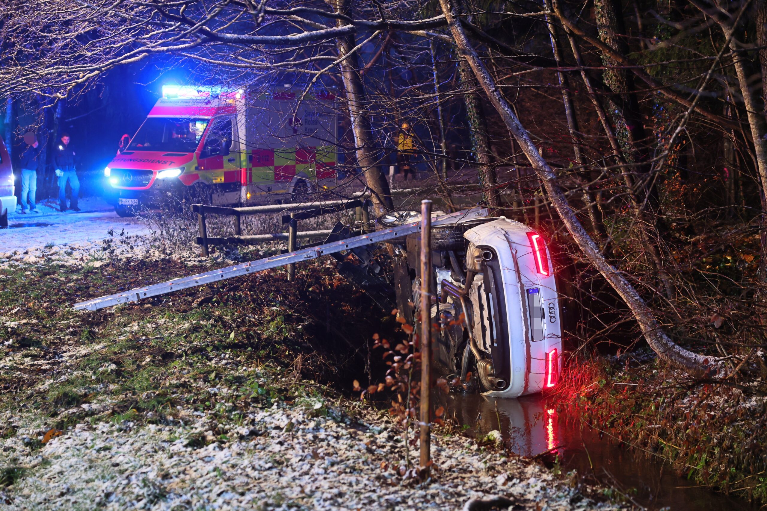 Besonders schwerwiegend war ein Unfall zwischen Brüchlins und Ottobeuren im Unterallgäu: Ein Audi geriet in einer Linkskurve auf schneeglatter Fahrbahn ins Rutschen, kam von der Straße ab und kippte in einen Bach. Der Fahrer war im Fahrzeug eingeschlossen und konnte von der Feuerwehr gerettet werden. Er wurde anschließend ins Krankenhaus gebracht.